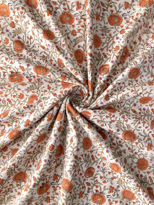 ハンドブロックプリント ホワイト オレンジ 花柄 コットンプリント生地 #296-3