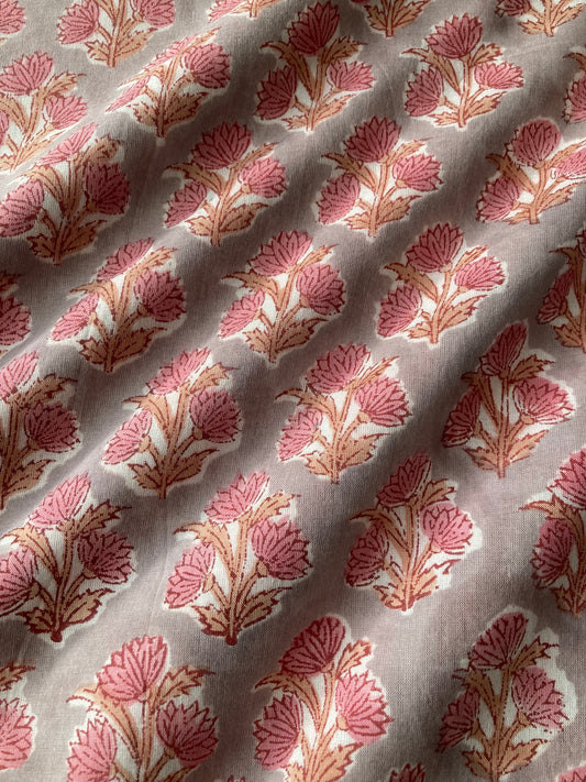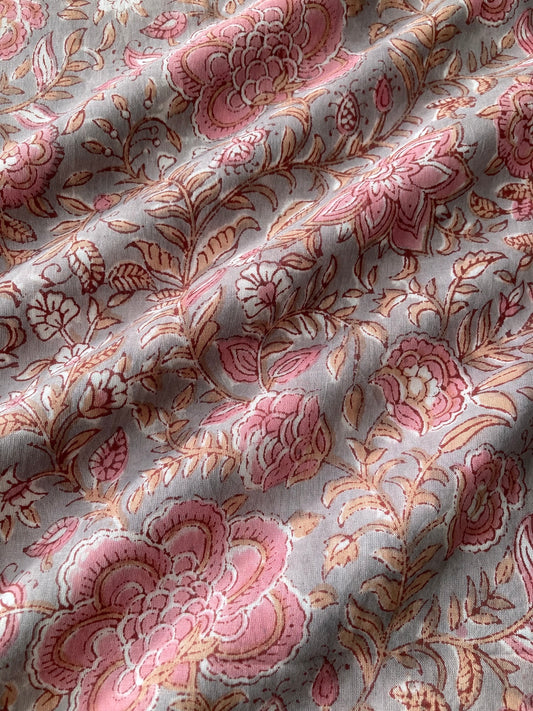 ハンドブロックプリント グレー x ピンク 花柄 コットンプリント生地 #289-13