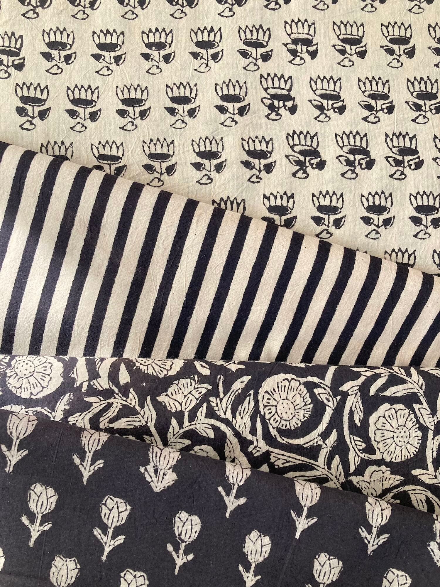 ハンドブロックプリント バグルーブラックストライプ コットン生地 #289-1