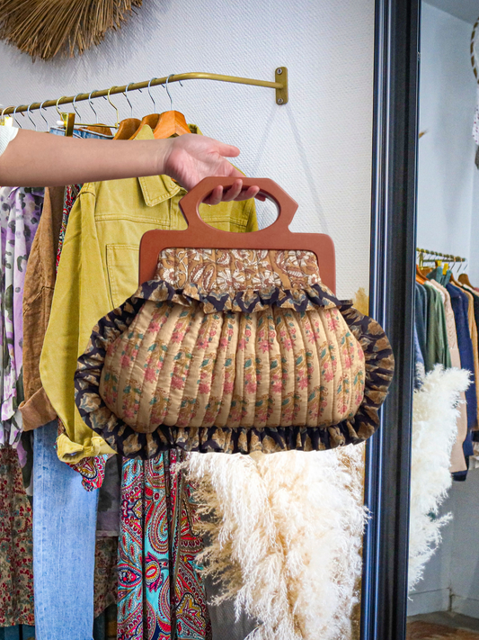 Wooden Handle Hand Block Print Ruffle Quilted Bag