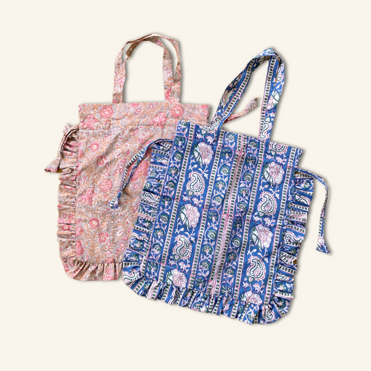 Hand Block Print Fabric Frill Tote Bag Gray / Blue