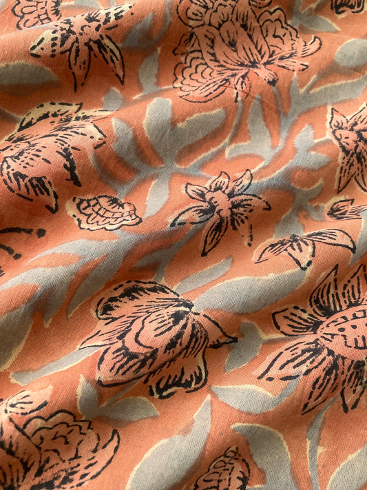 Hand Block Print Peach Color Floral Cotton Fabric #287-7