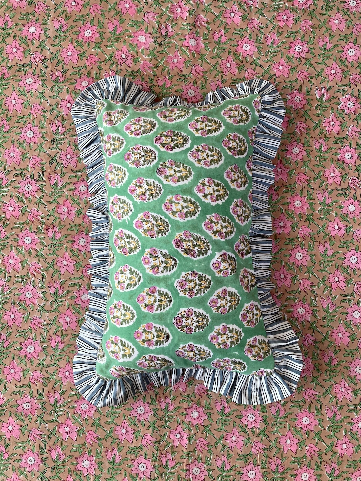 The ruffle-filled pillowcase in hand block print fabric is reversible front and back. Perfect for accenting a bedroom, nursery, or living room.
