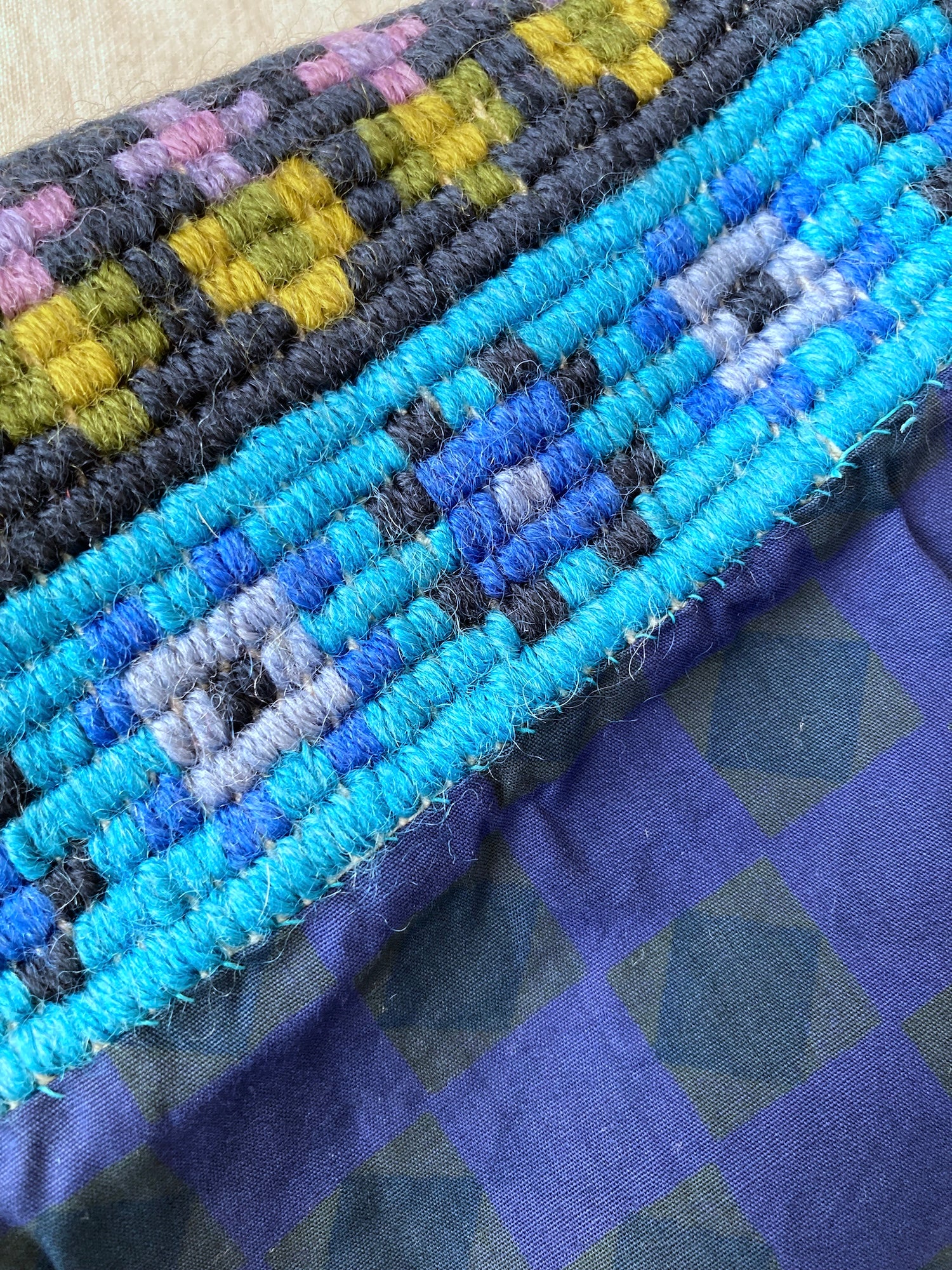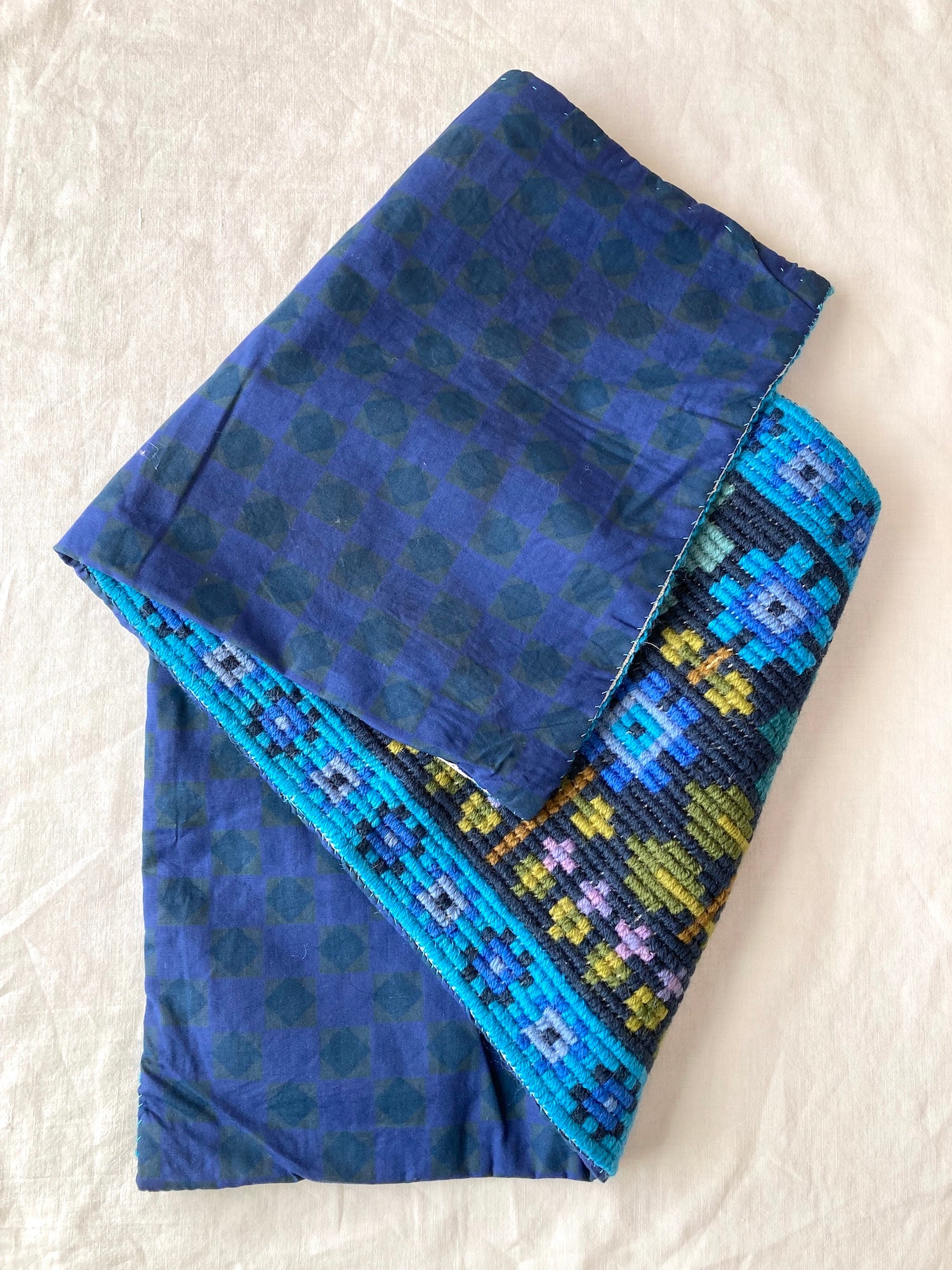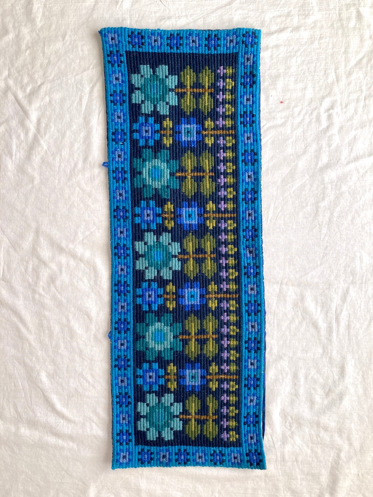 This mid-century Scandinavian vintage mat features a beautifully handwoven floral pattern in deep blue and green yarns. Crafted in the 1950s–60s, it showcases the warmth of wool and the tactile charm of handmade craftsmanship.