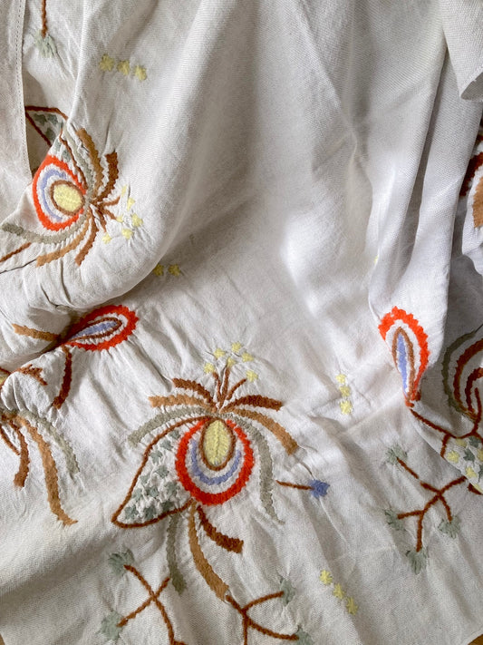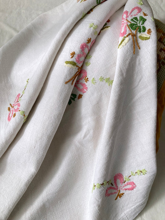 Bohemian Vintage Cotton Linen Textile with Chunky Wool Embroidery – Tablecloth or Throw