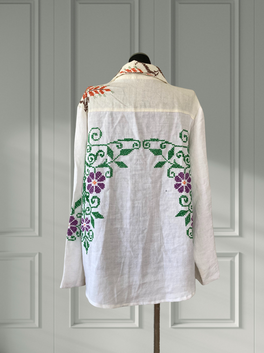 Vintage Embroidery Upcycled Button-Front Shirt Jacket- Embroidered Textile