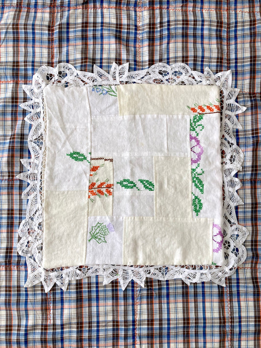 Vintage Embroidered Linen and Cotton Lace Quilted Cushion Cover
