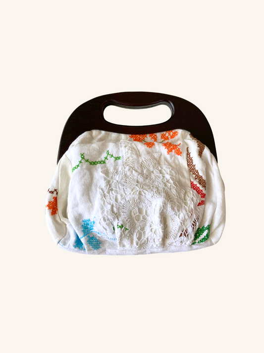 ヴィンテージ刺繍 リネン コットン パッチワーク 木製ハンドル がま口 バッグ
