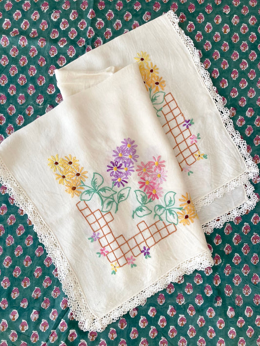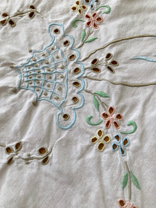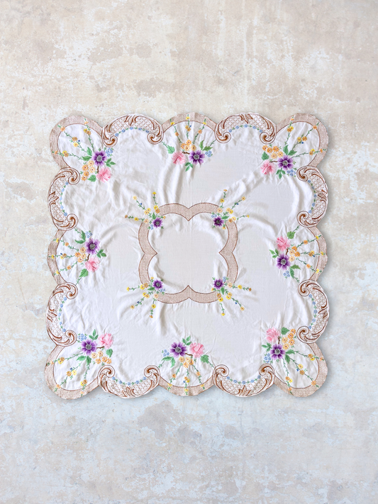 Vintage Hand Embroidered Cotton Linen Multi Cloth – Colorful Scalloped Square