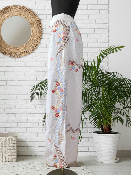 Upcycled Long Wide -Leg Pants Made from Colorful Vintage Cotton Embroidered Fabric