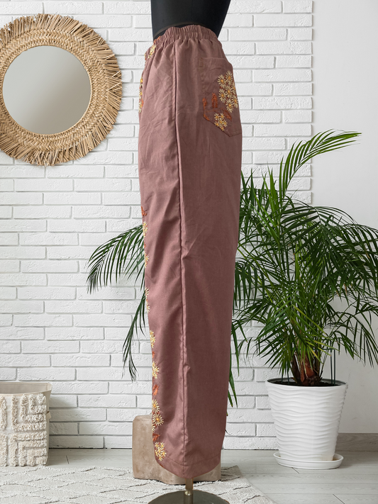 Upcycled Long Easy Pants Made from Brown Vintage Embroidered Fabric