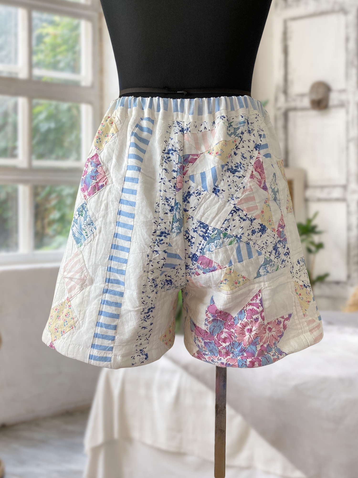 These shorts are remade from vintage quilted fabric with light padding.