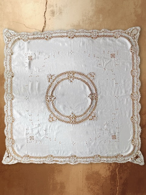 Vintage French Linen Cotton Cloth with Cutwork & Crochet Lace (1920s-40s)