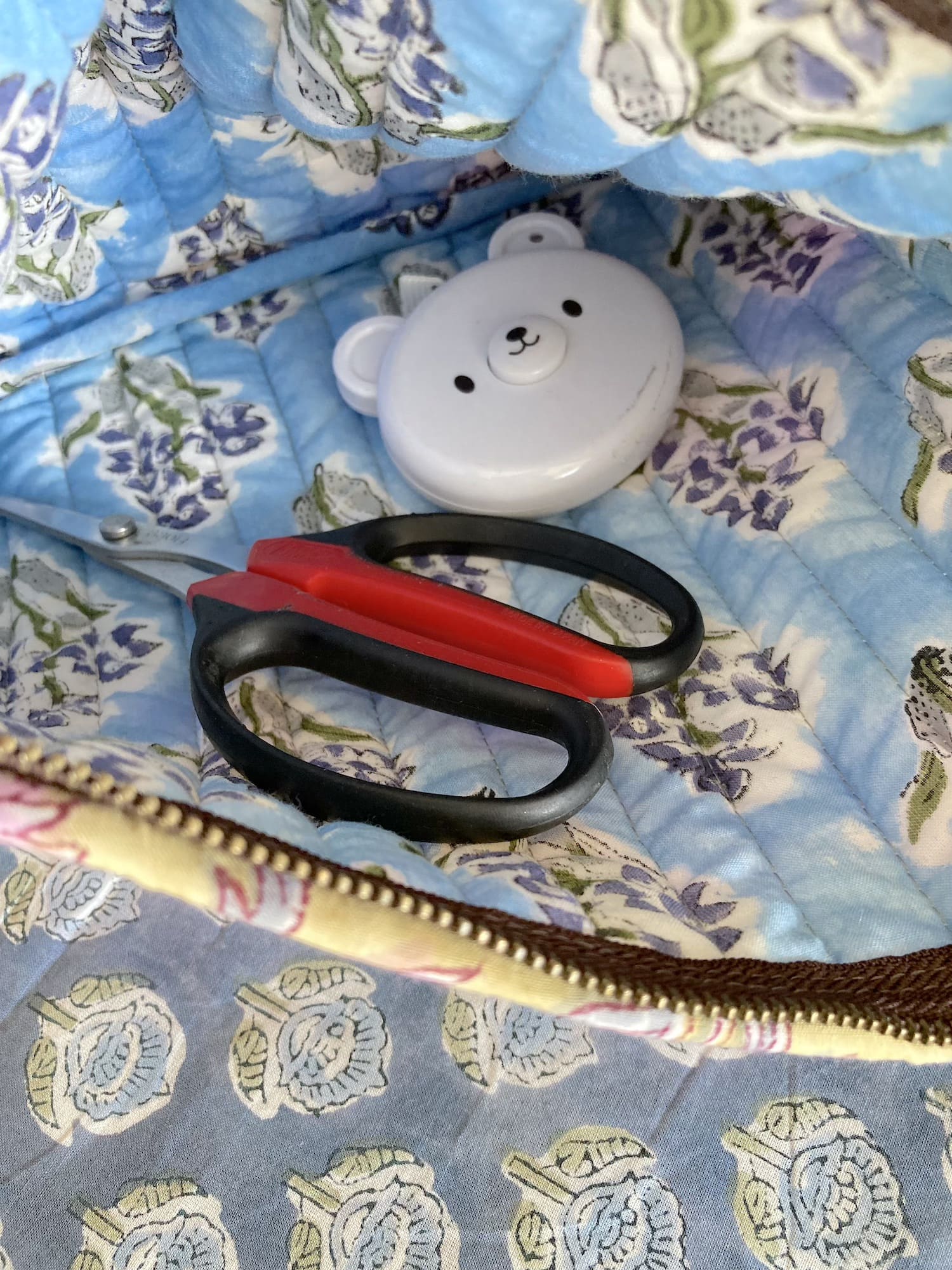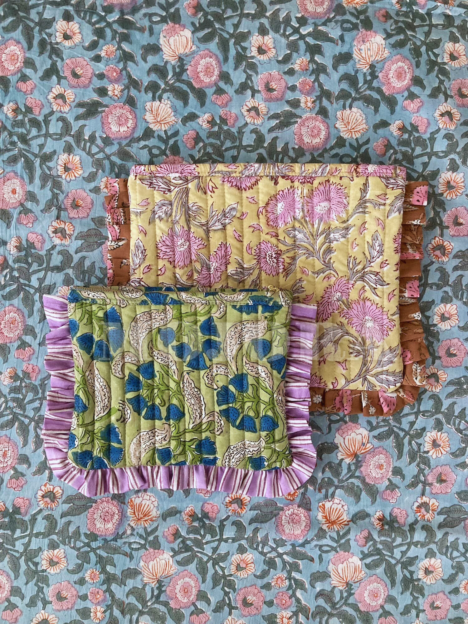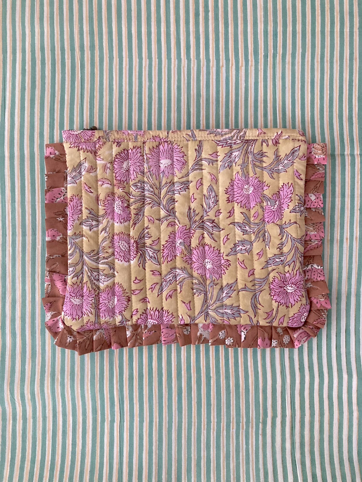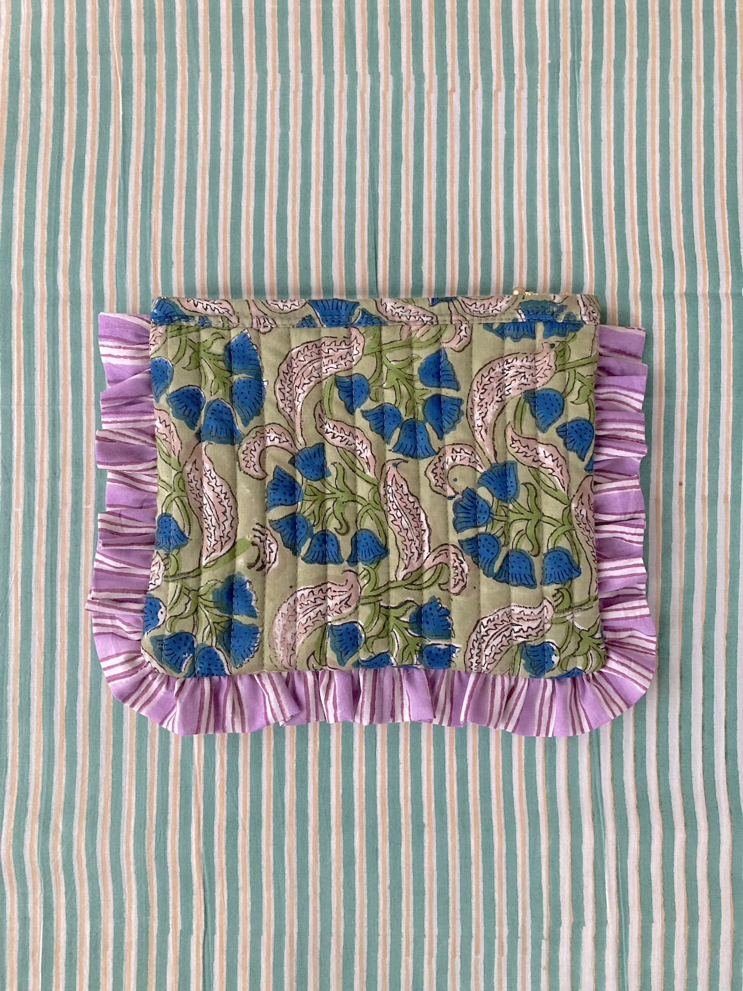 This quilted pouch features block print fabric with charming frills.