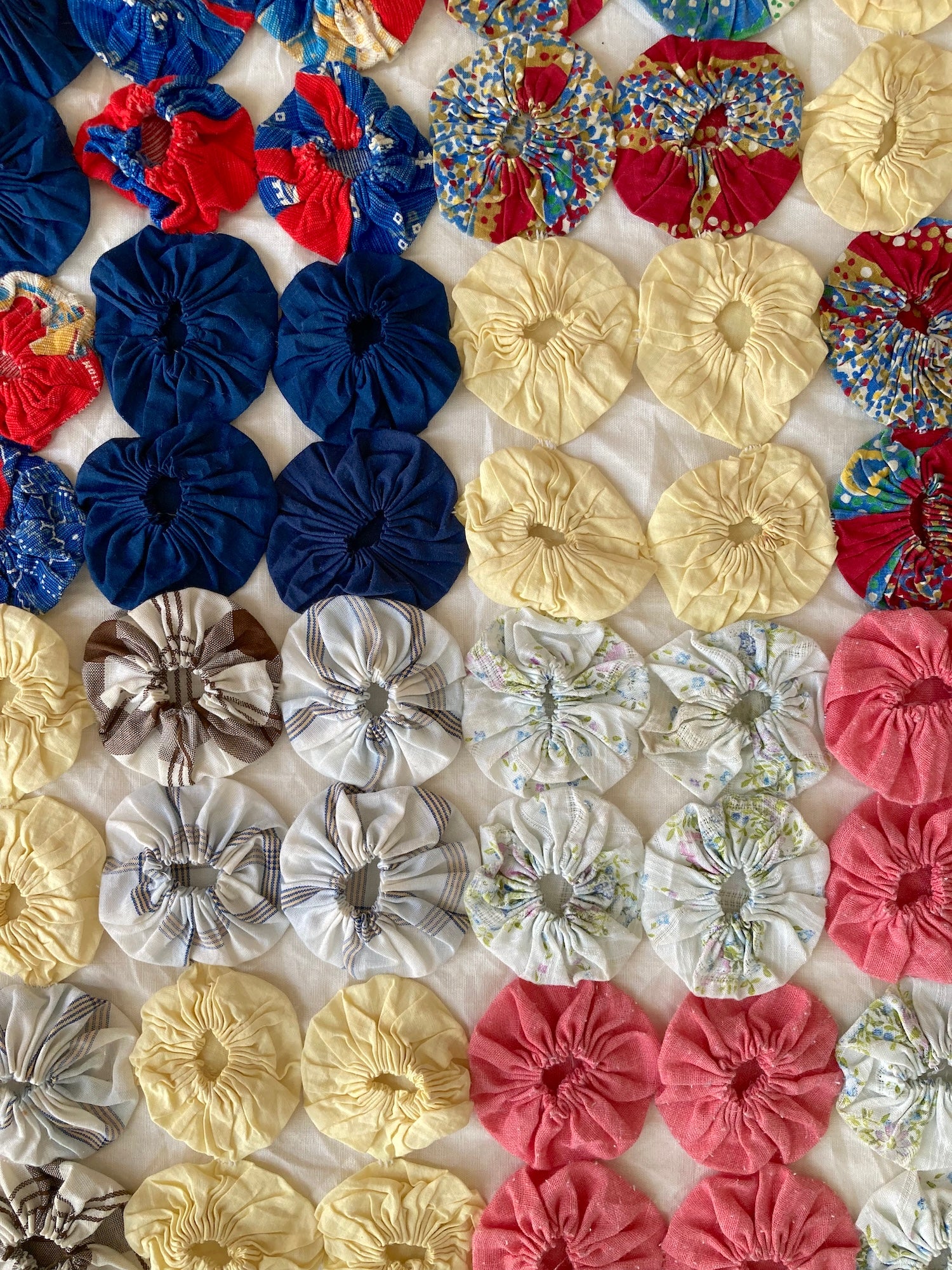 Yo-yo quilts were popular in America throughout the early to mid-20th century, admired for their delicate handwork and cheerful patterns.