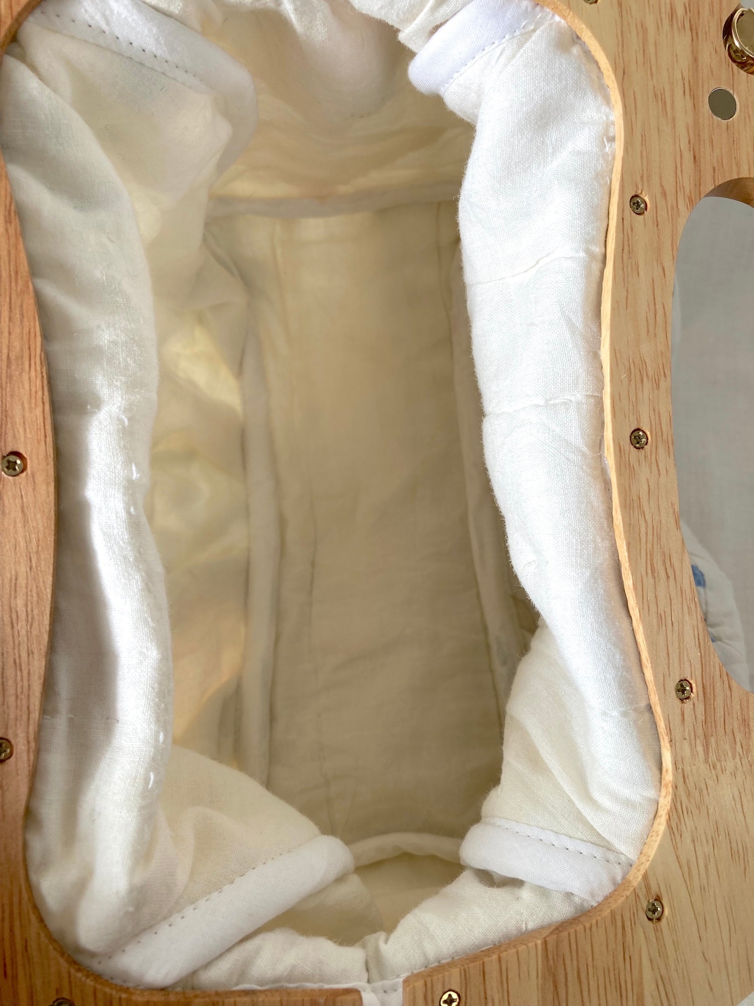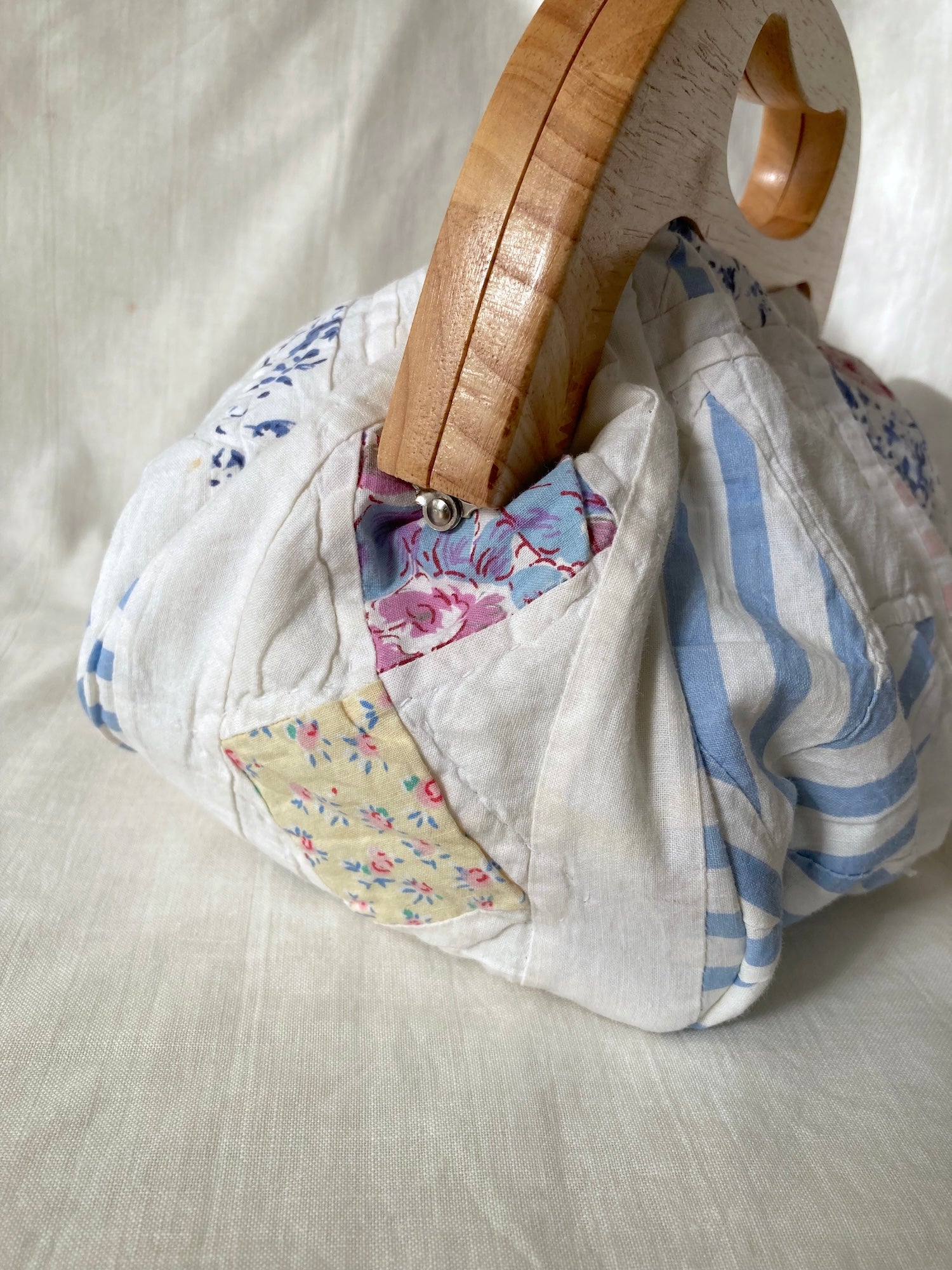 The quilt fabric has a soft, well-loved feel, while the wooden handle adds a neat, structured touch.