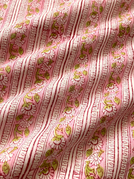 ハンドブロックプリント ピンク 花柄 ライン コットン生地 #265-9