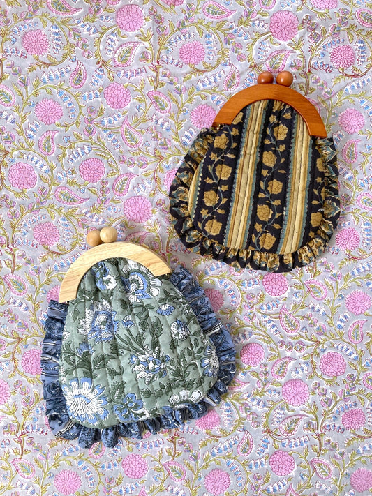 木製 がま口 ブロックプリント キルティング フリル ミニバッグ / ポーチ