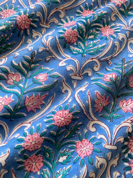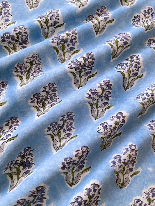ハンドブロックプリント ライトブルー 花柄 コットンプリント生地 #230-33