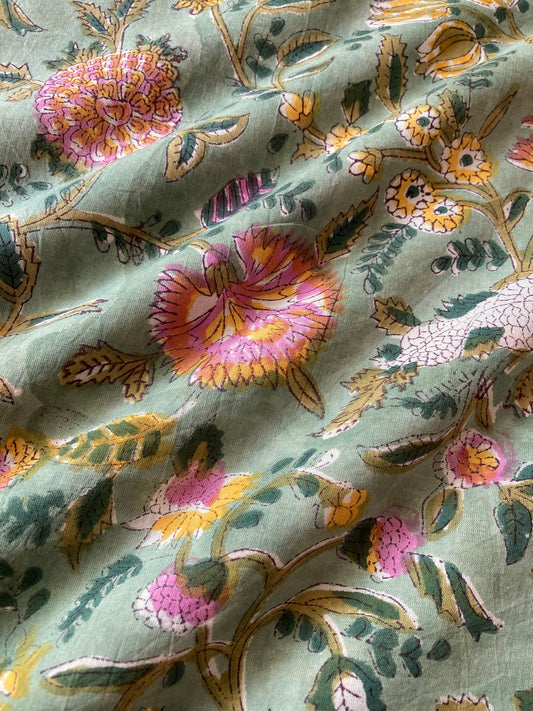 ハンドブロックプリント スモーク グリーン 花柄 コットンプリント生地 #264-3