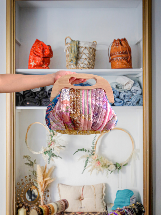 木製 ハンドル ブロックプリント パッチワーク キルティング ハンドバッグ クラッチバッグ