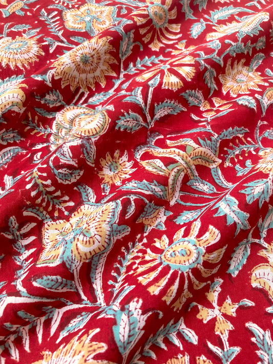 【pre-cut 45cm】インド ハンドブロックプリント レッド装飾耳あり 花柄 コットン生地 #166-12