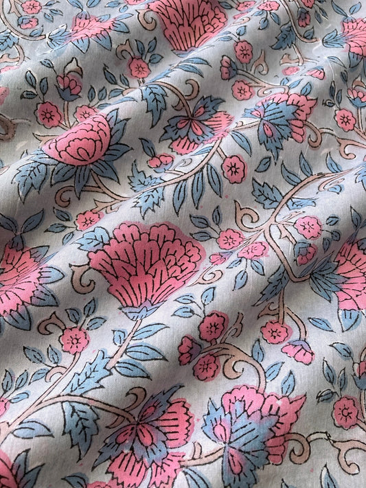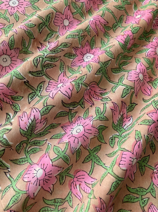 【 pre-cut 60cm】ハンドブロックプリント ピンク ベージュ 花柄 コットンプリント生地 #249-26