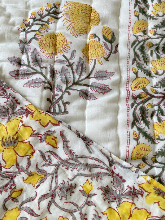 ハンドブロックプリントリバーシブルキルトシングルサイズ Yellow 送料無料