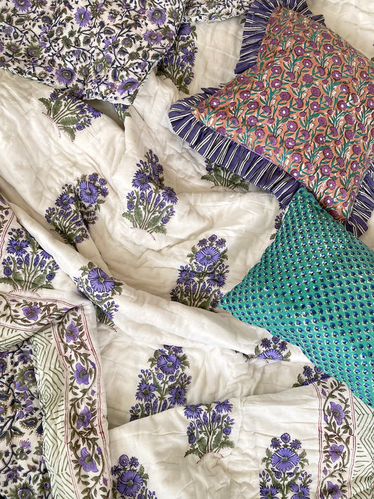 ハンドブロックプリントリバーシブルキルトシングルサイズ Purple 送料無料