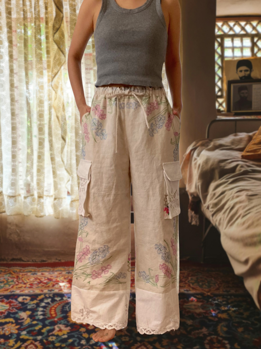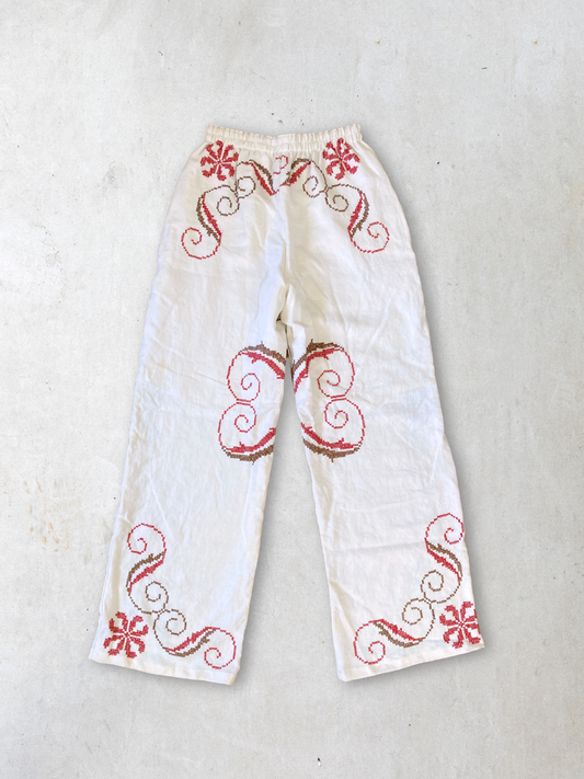 ヴィンテージ 刺繍クロス アップサイクル リネン イージーパンツ アンティーク リメイク