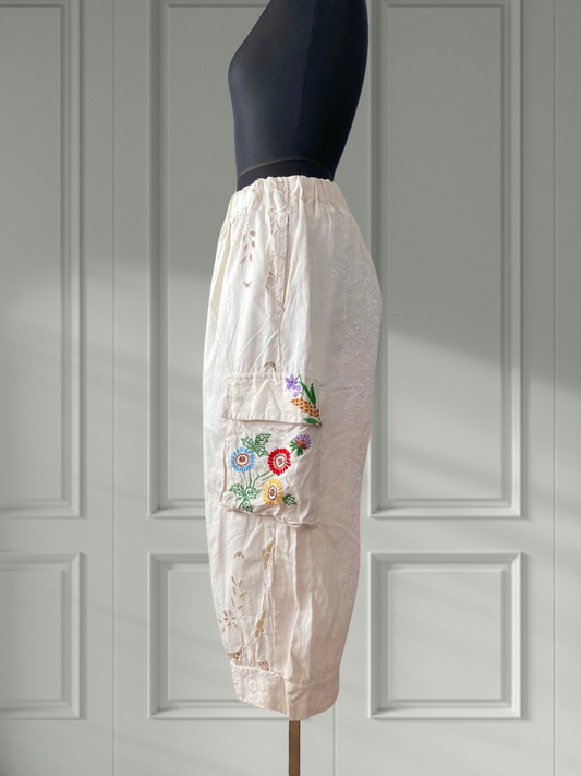 ヴィンテージ 刺繍クロス アップサイクル 裾ギャザーパンツ アンティーク リメイク