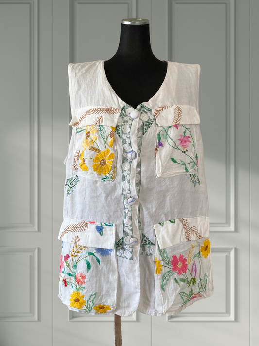 ヴィンテージ 刺繍 リネン 生地 リメイク ノースリーブシャツ