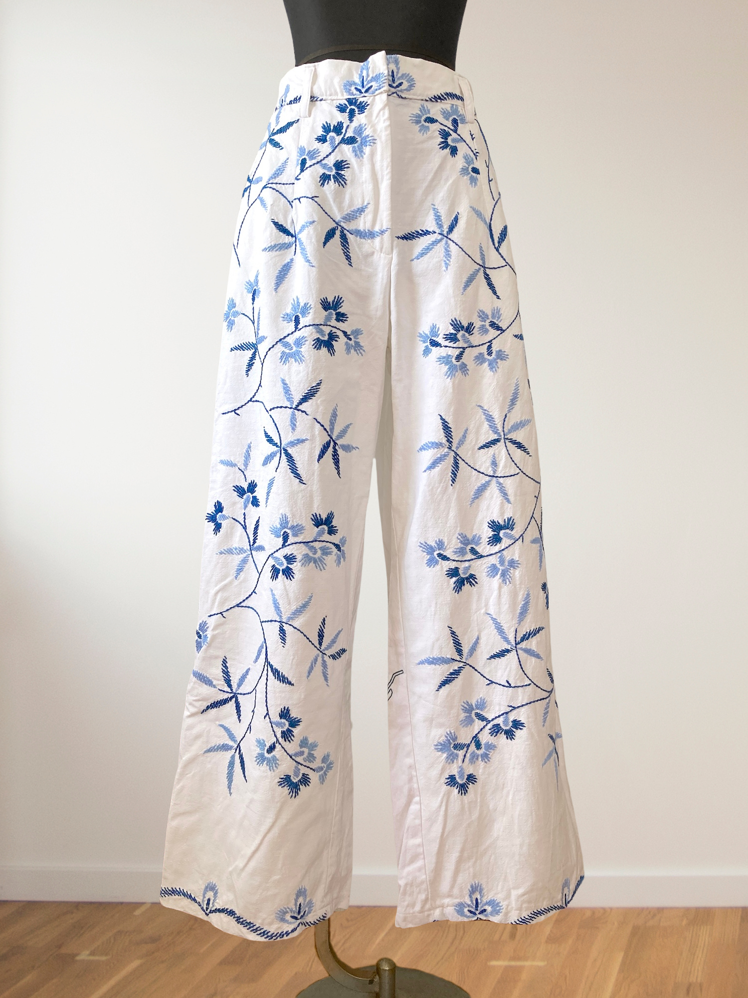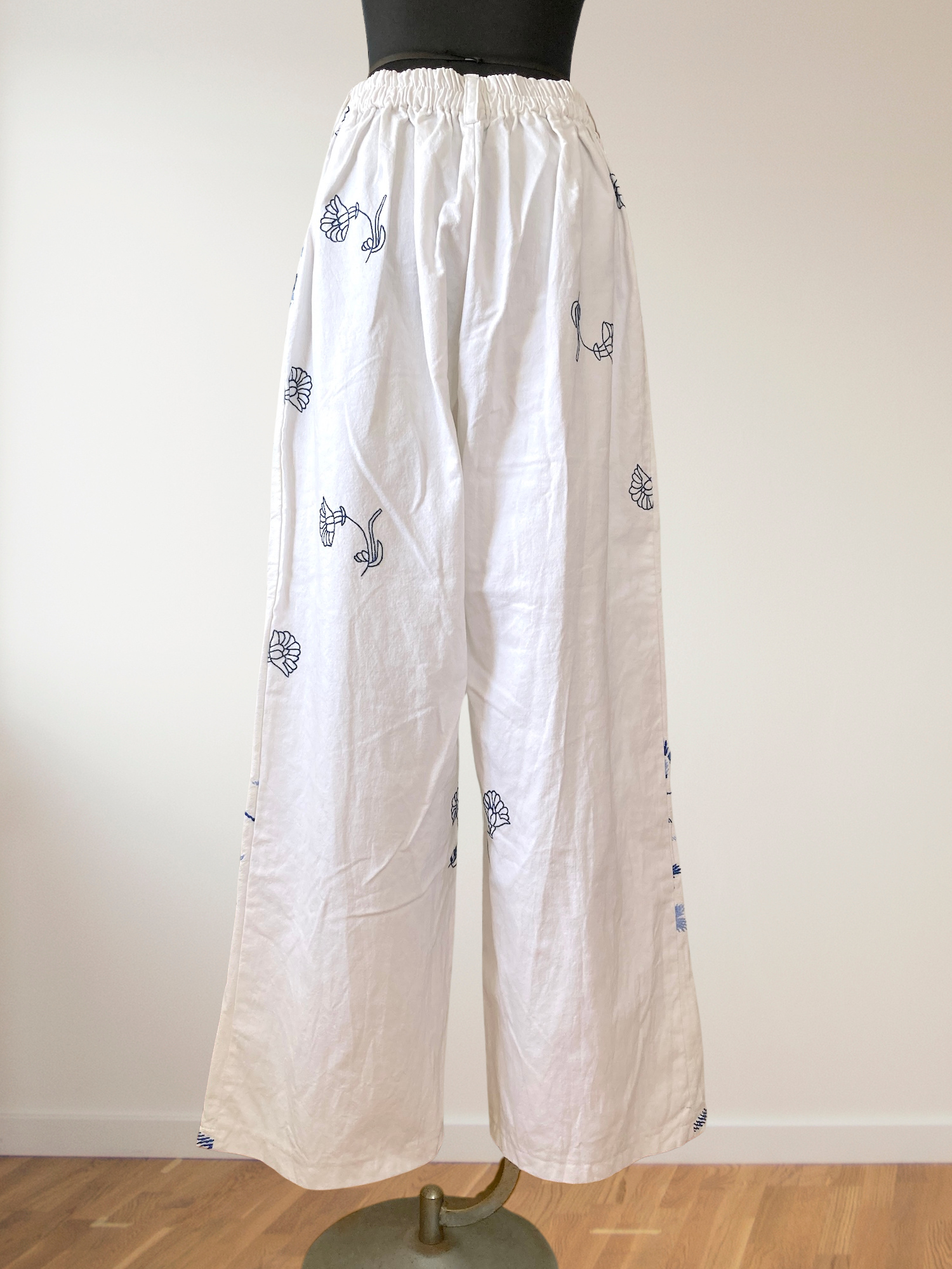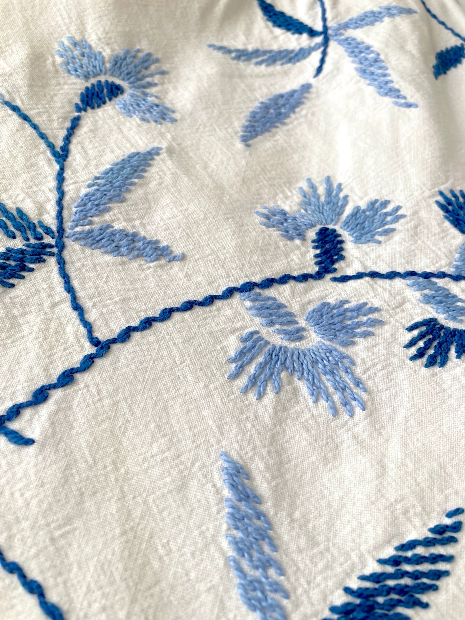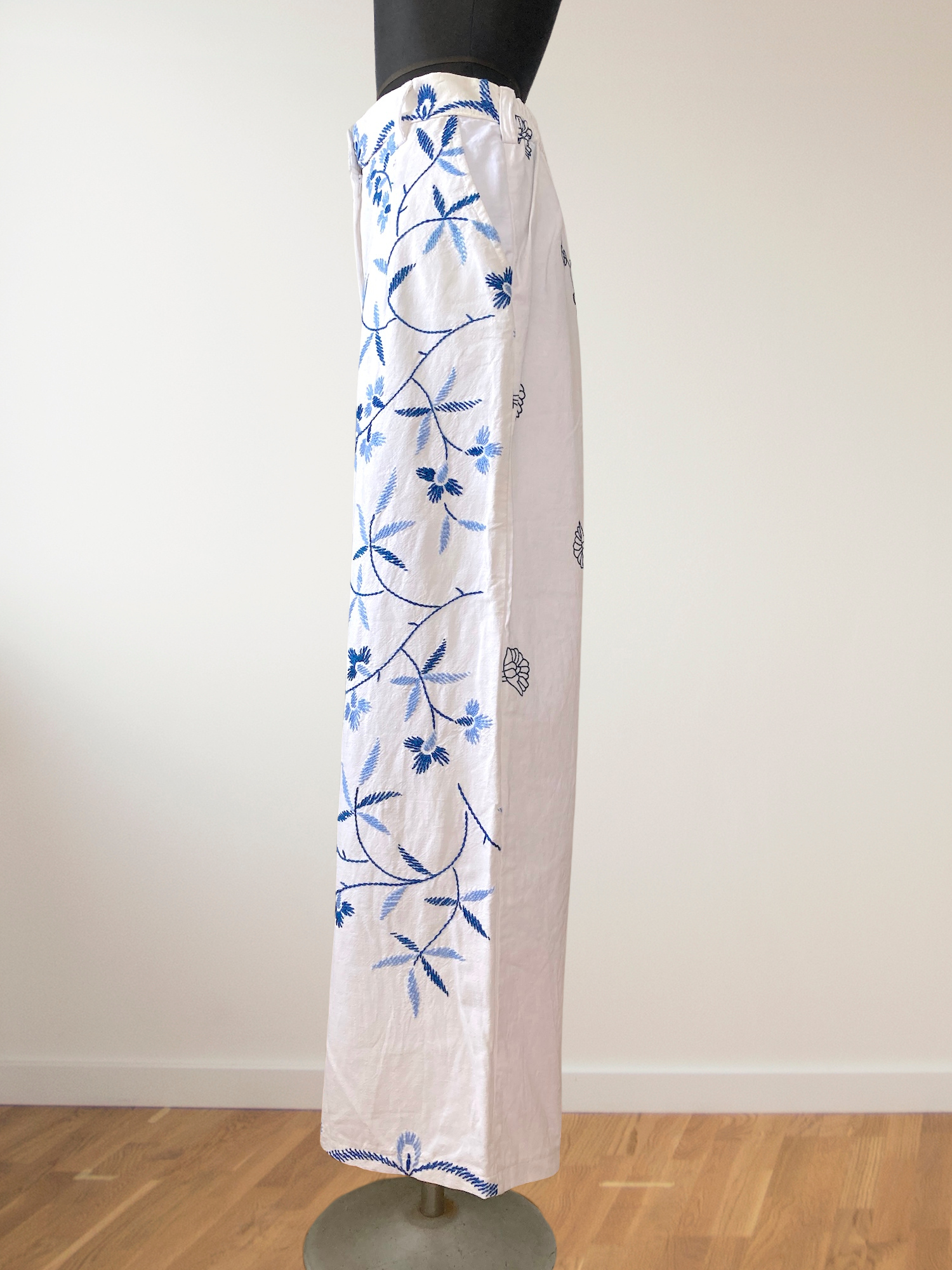 ヴィンテージの刺繍クロスをリメイクして作られた、とても素敵なデザインのパンツです。ブルー系のシンプルな刺繍なので、ヴィンテージリメイクを試してみたい方にもおすすめです。
