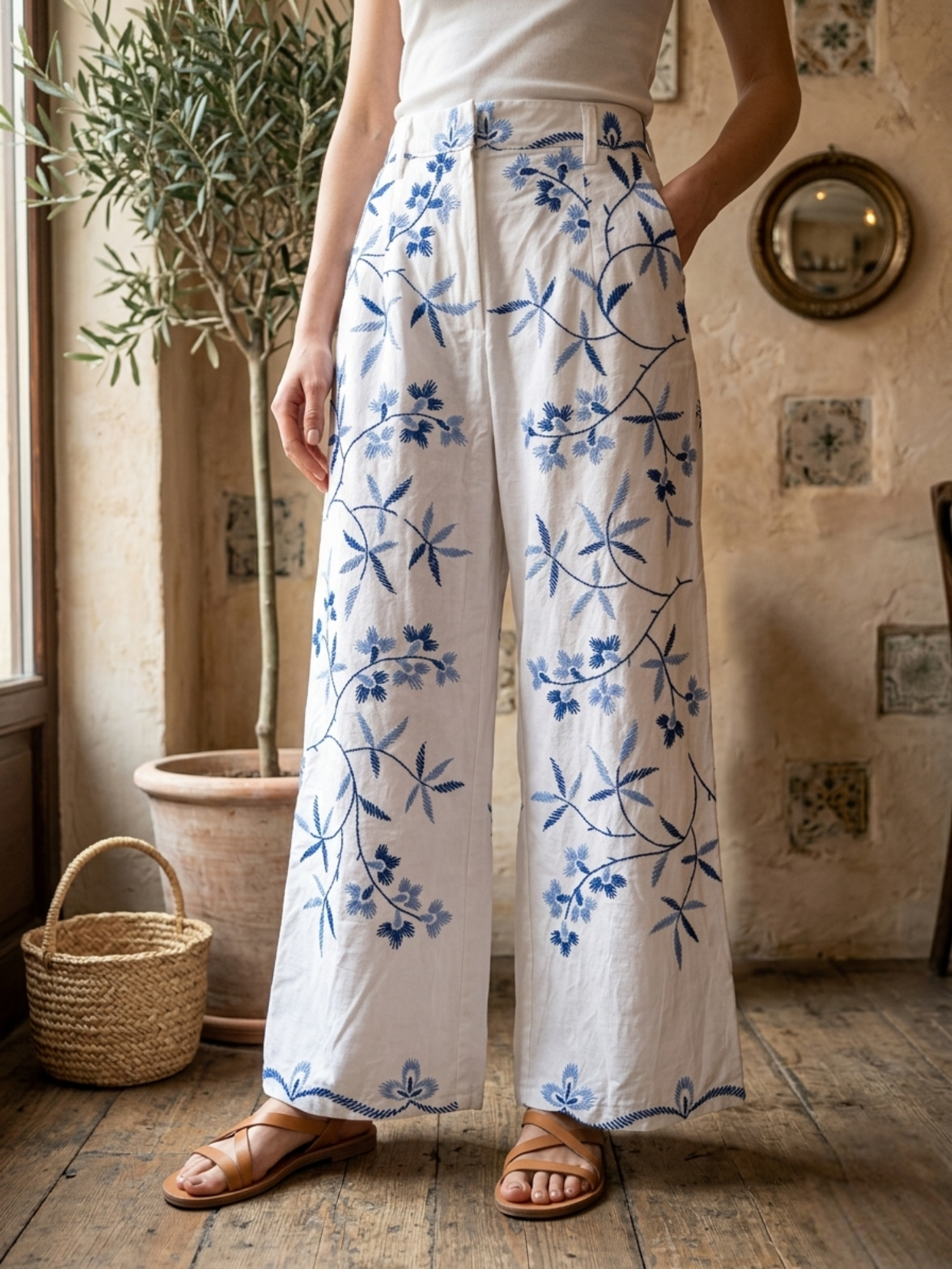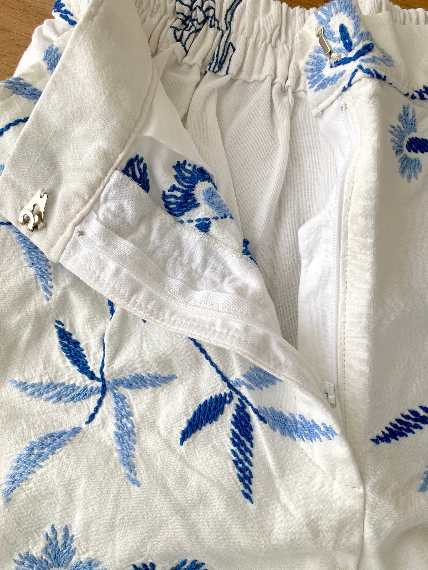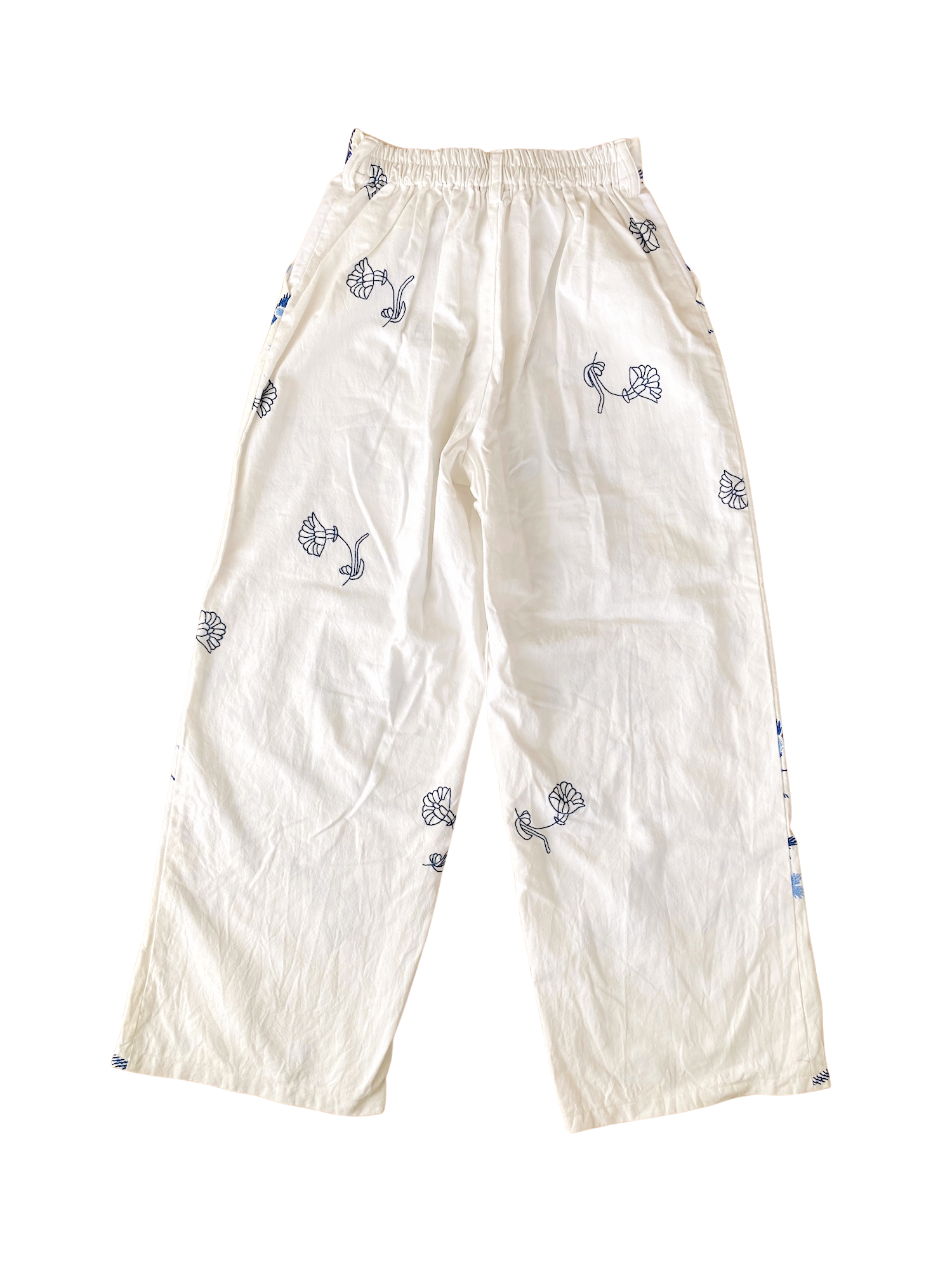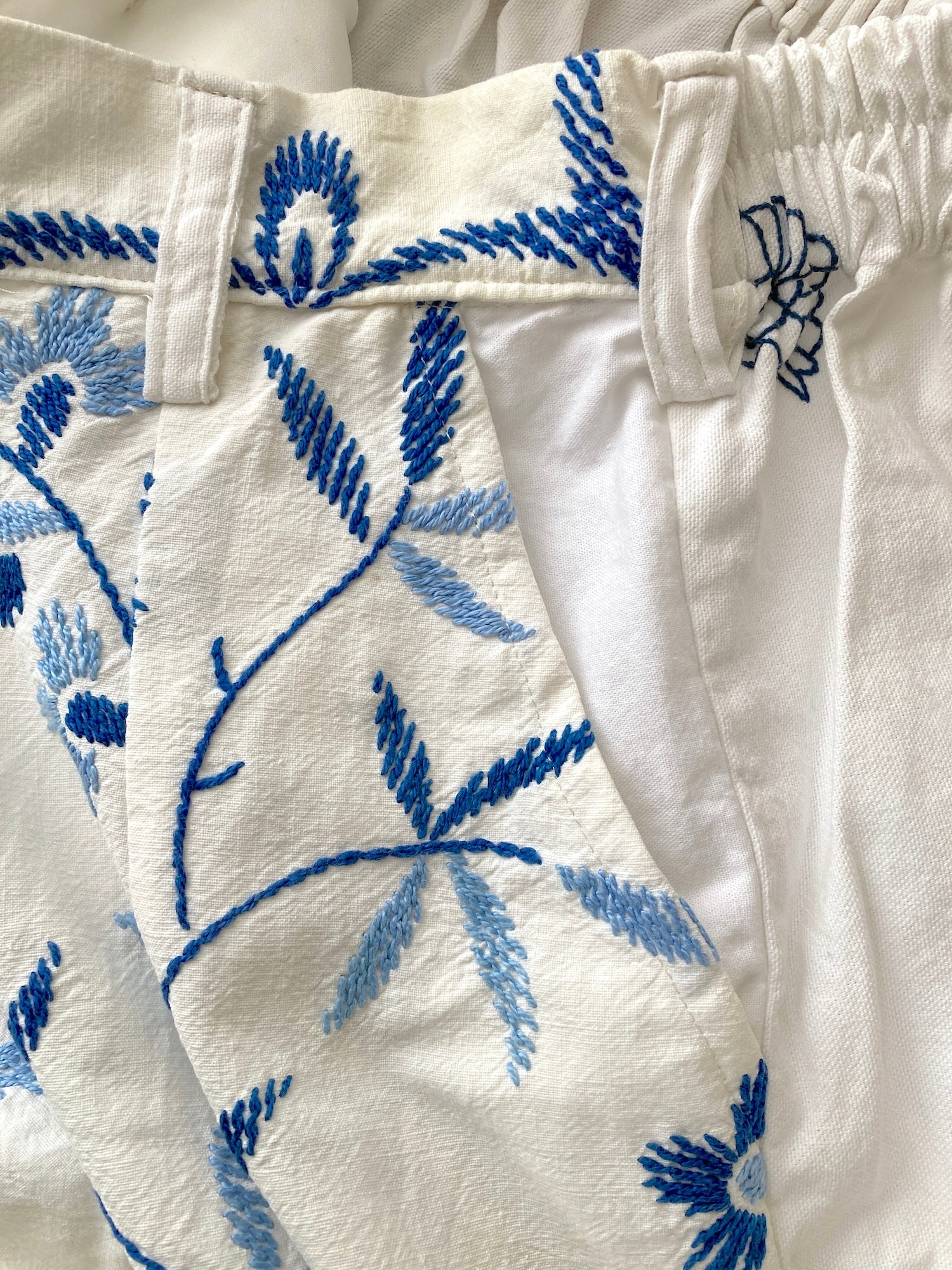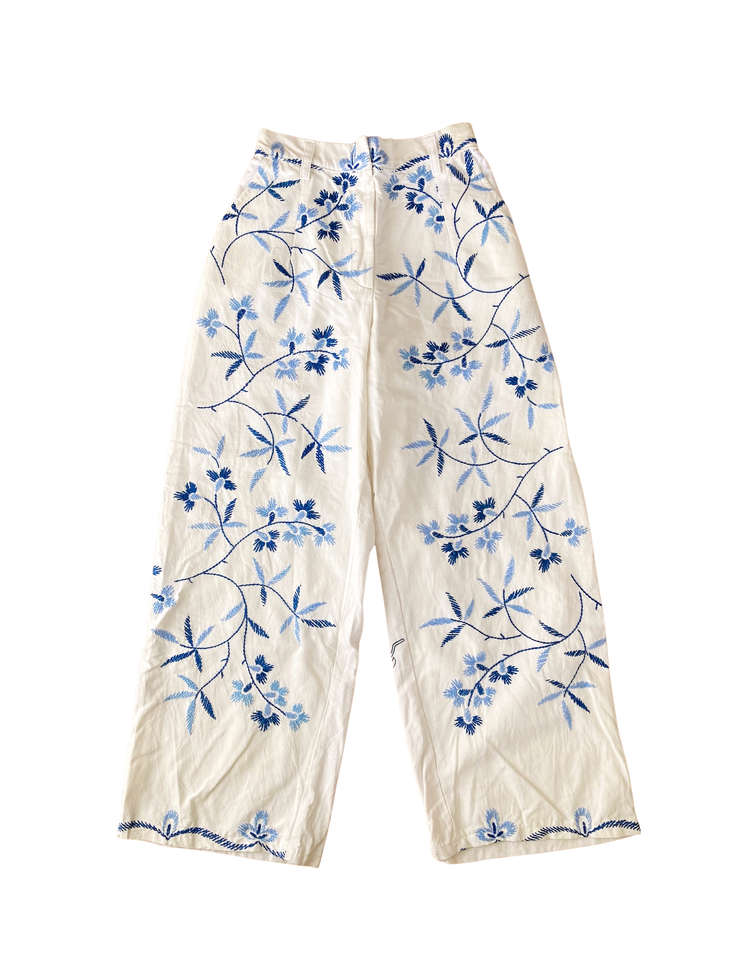 ヴィンテージの刺繍クロスをリメイクして作られた、とても素敵なデザインのパンツです。ブルー系のシンプルな刺繍なので、ヴィンテージリメイクを試してみたい方にもおすすめです。