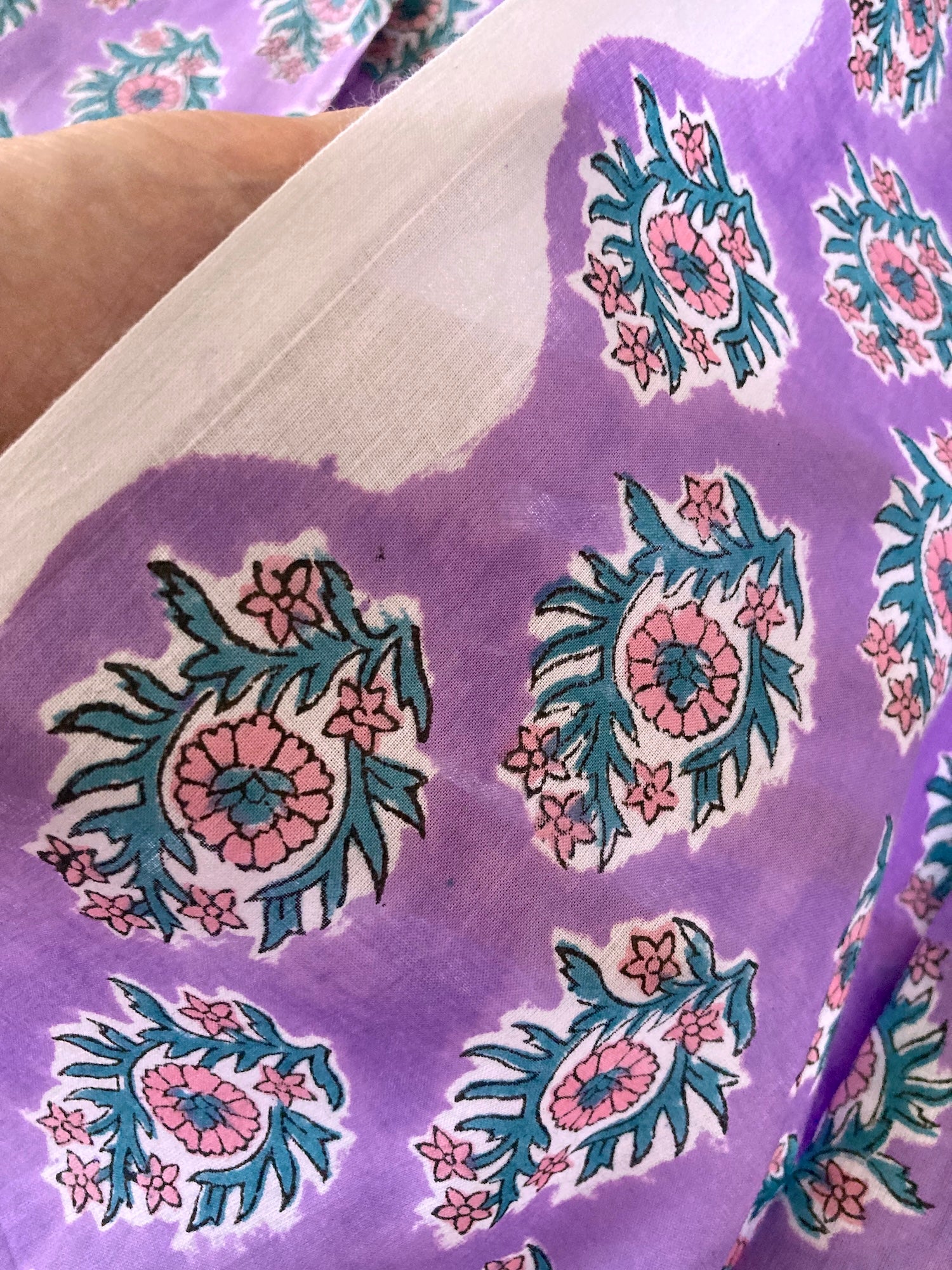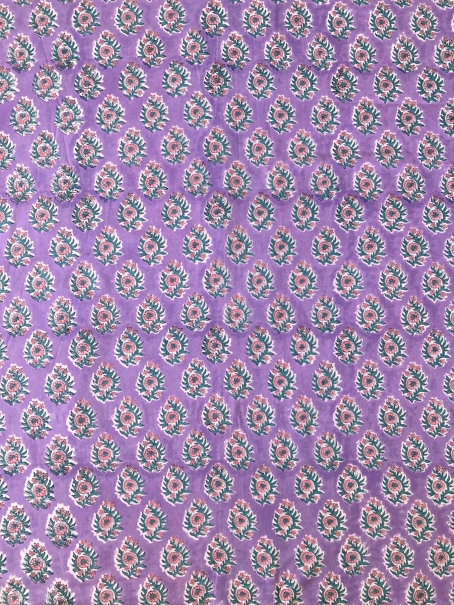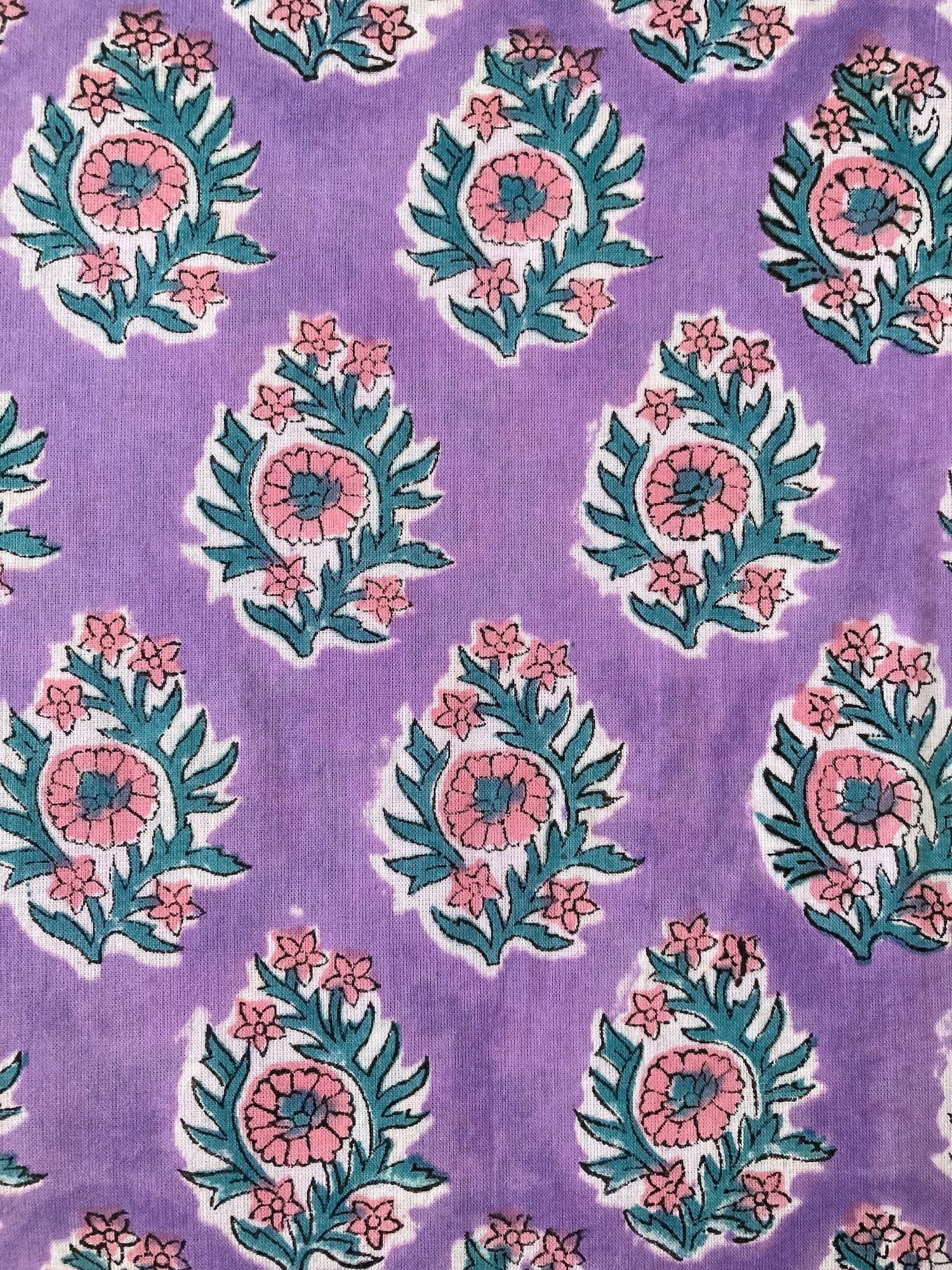 明るめのパープルに、ピンクとグリーンのブロックプリントらしい色柄です。キルティングなど小物にすると可愛い予感。