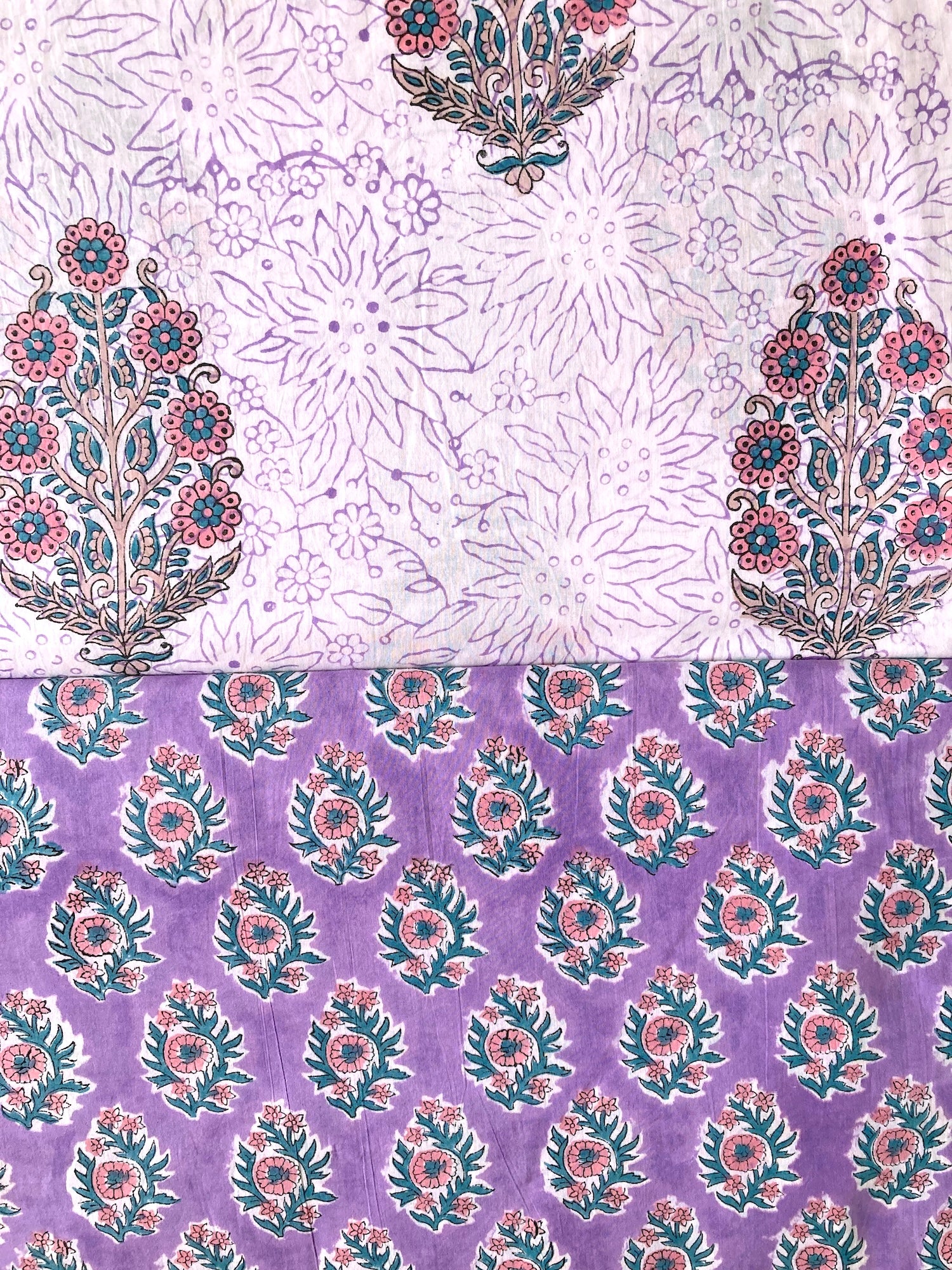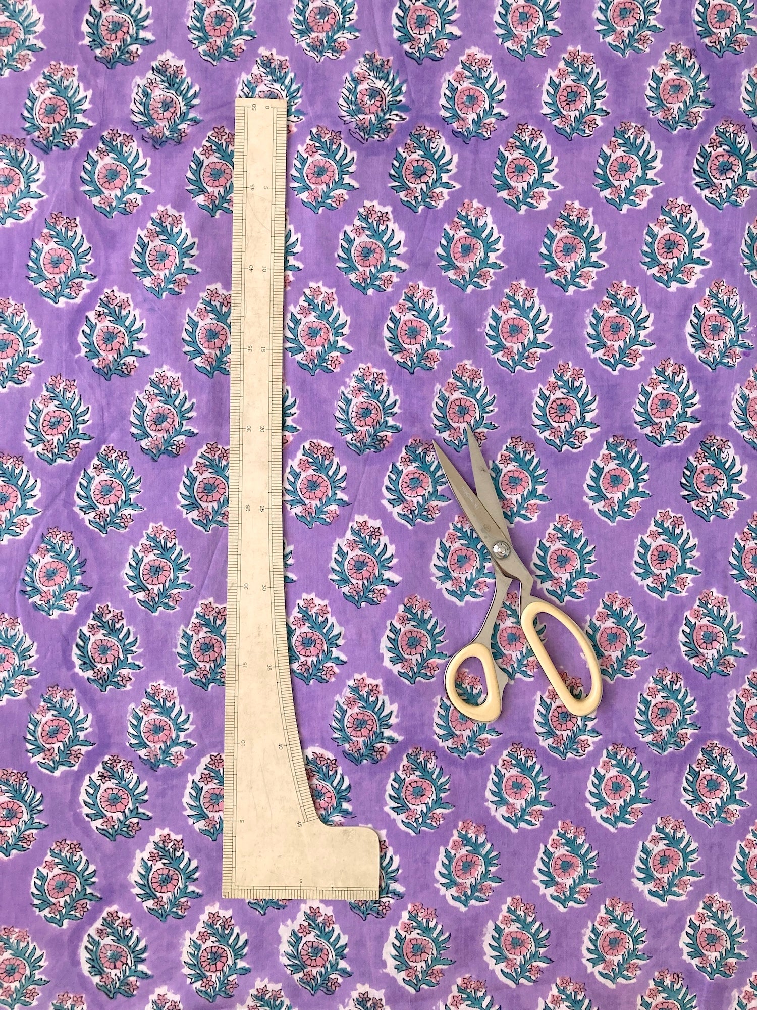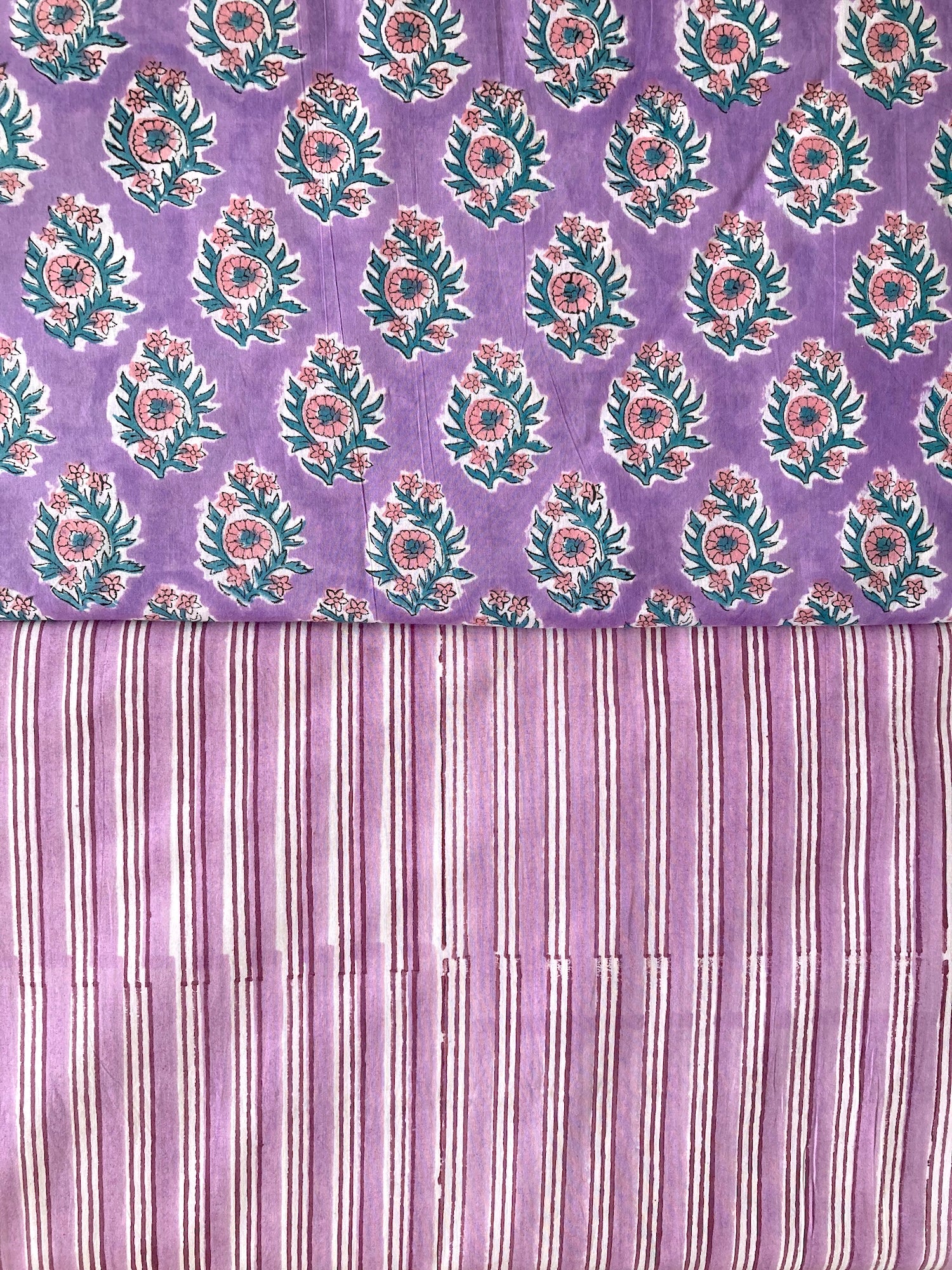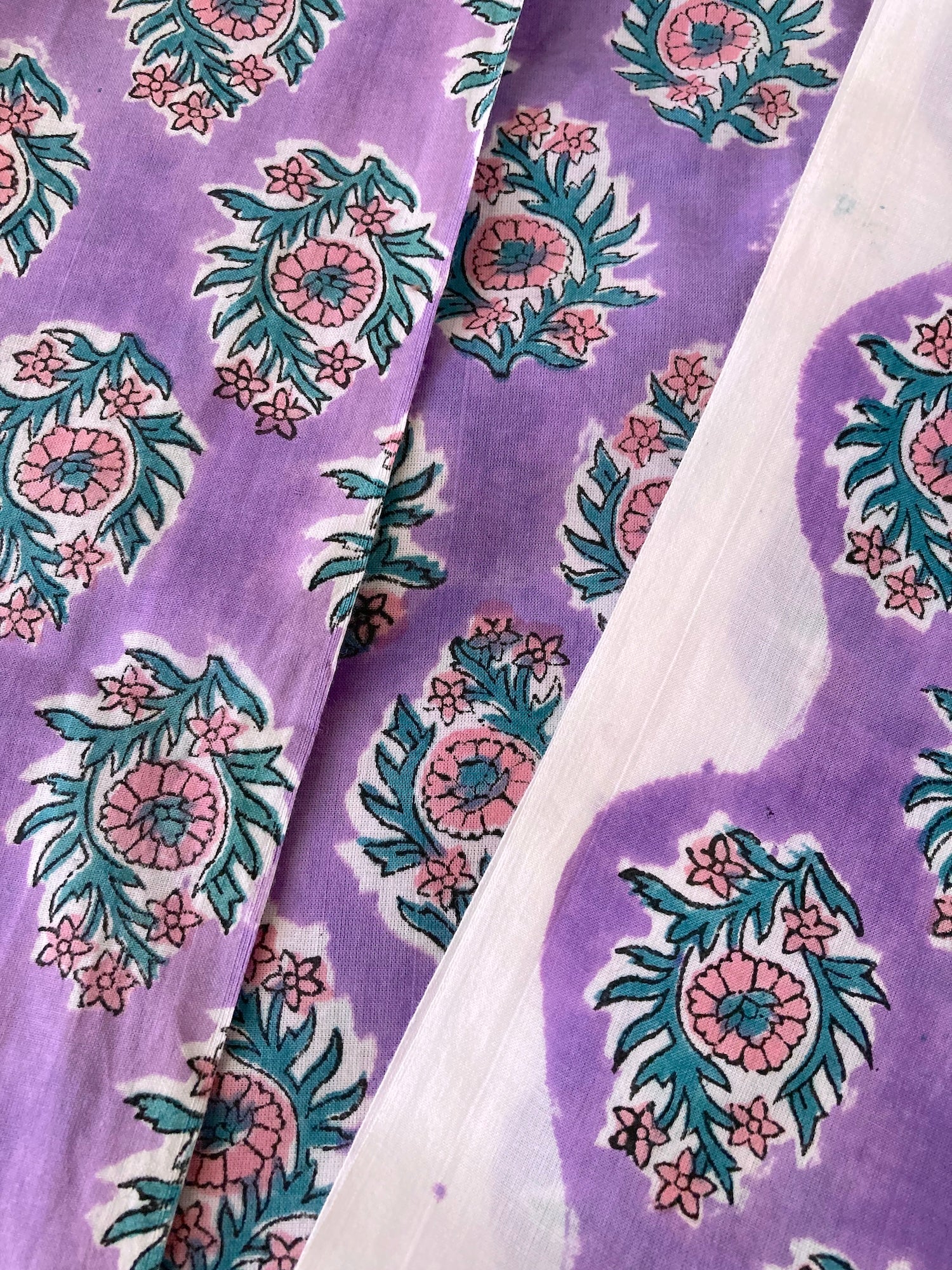 明るめのパープルに、ピンクとグリーンのブロックプリントらしい色柄です。キルティングなど小物にすると可愛い予感。