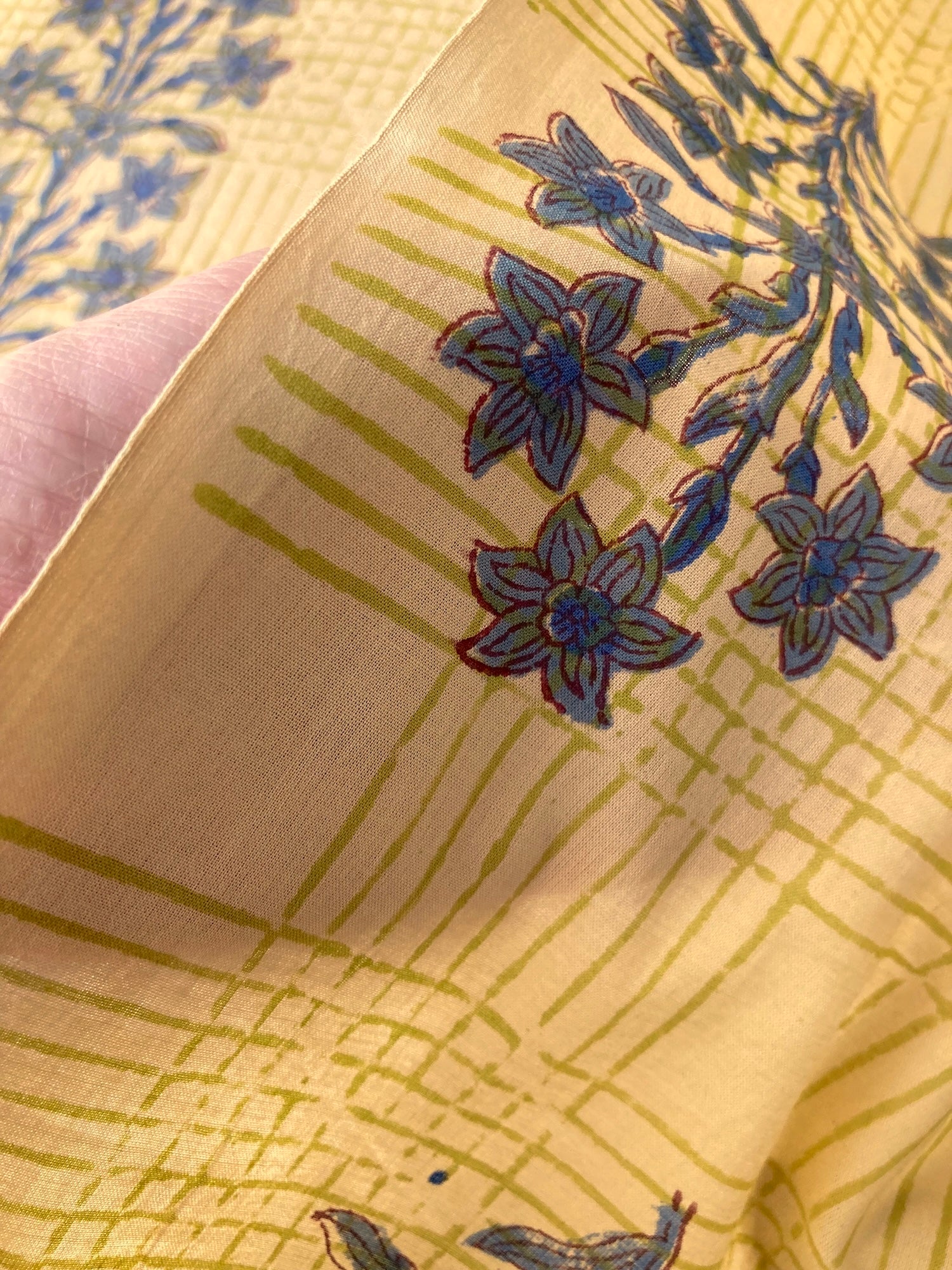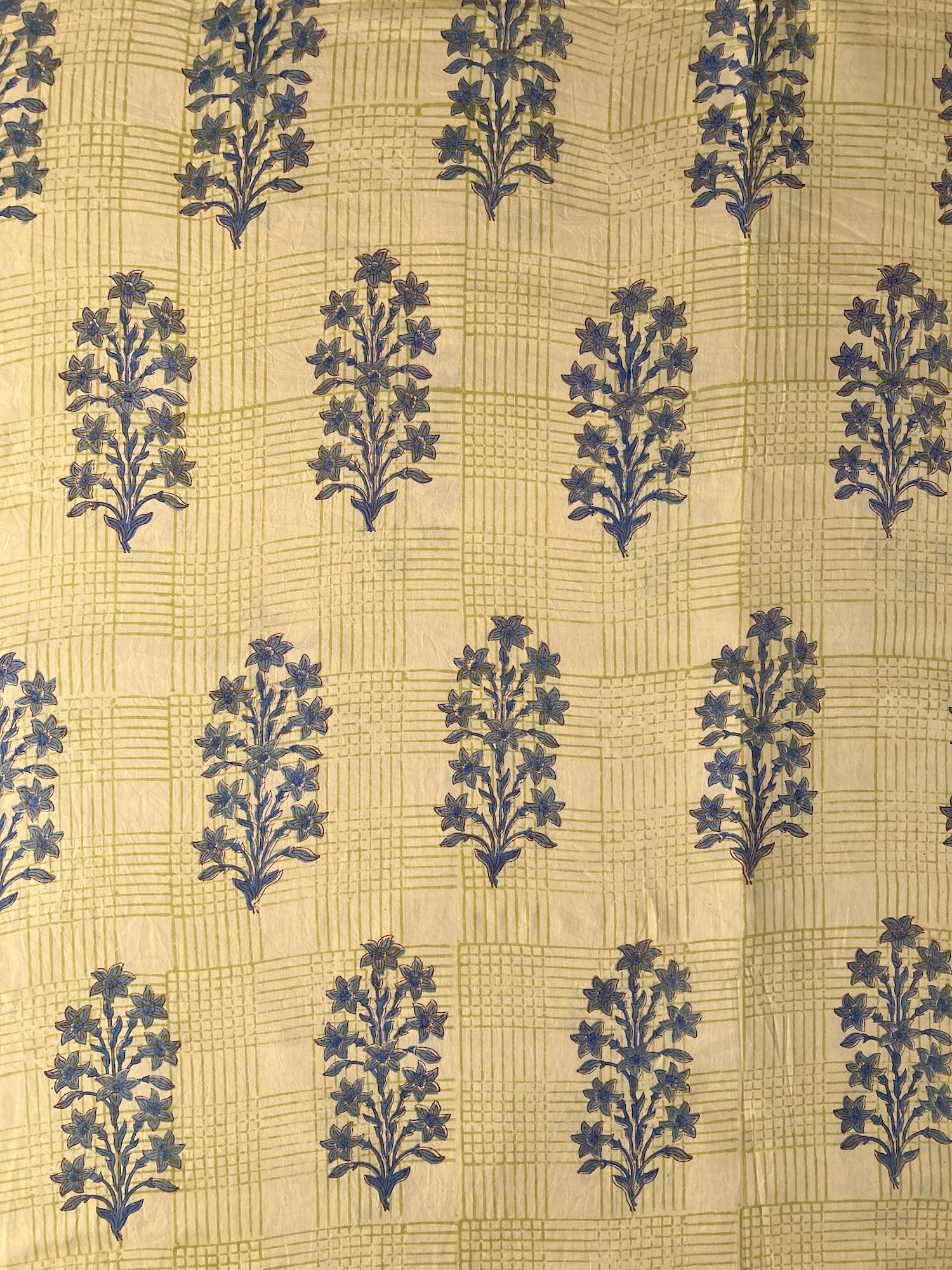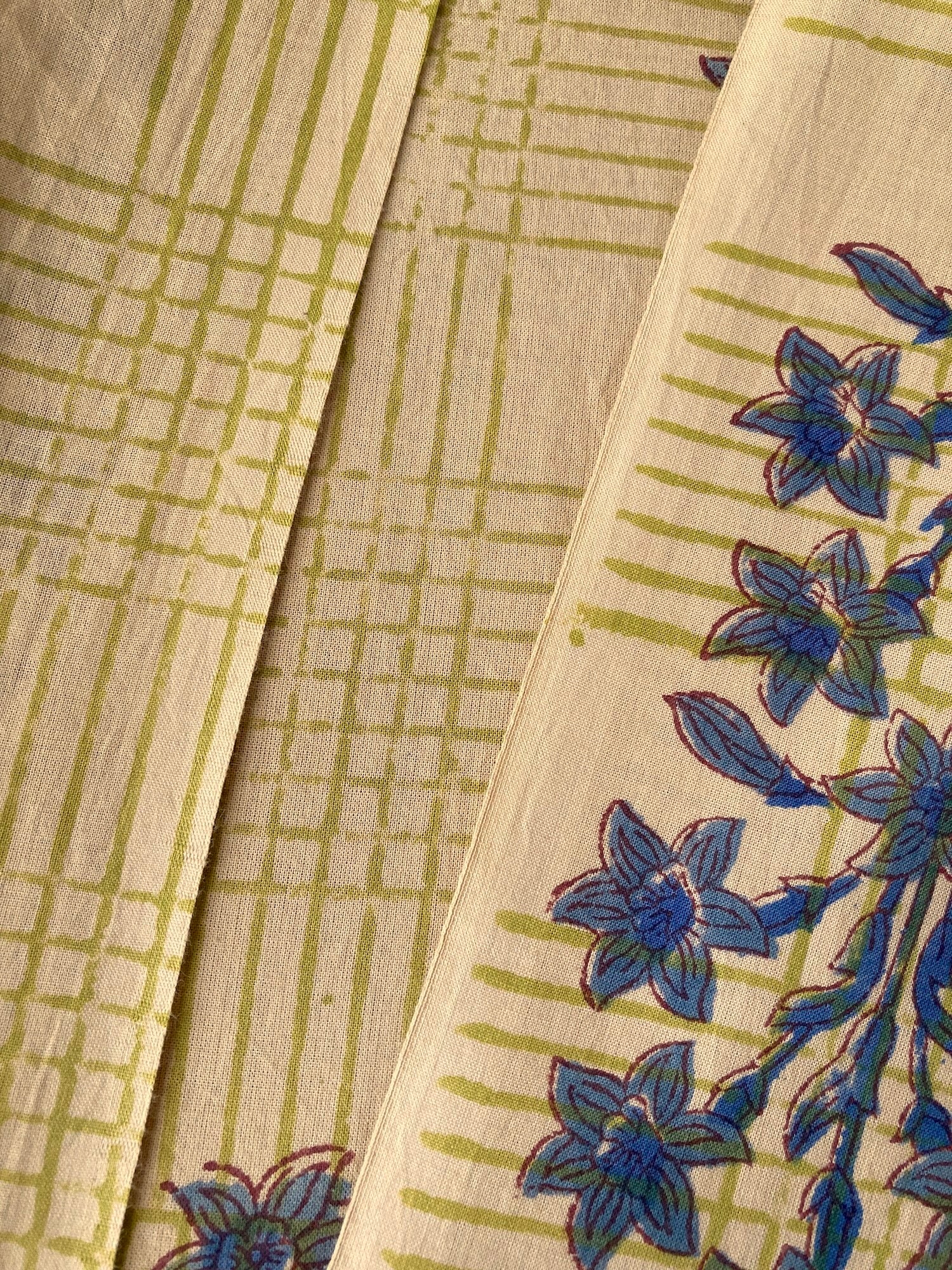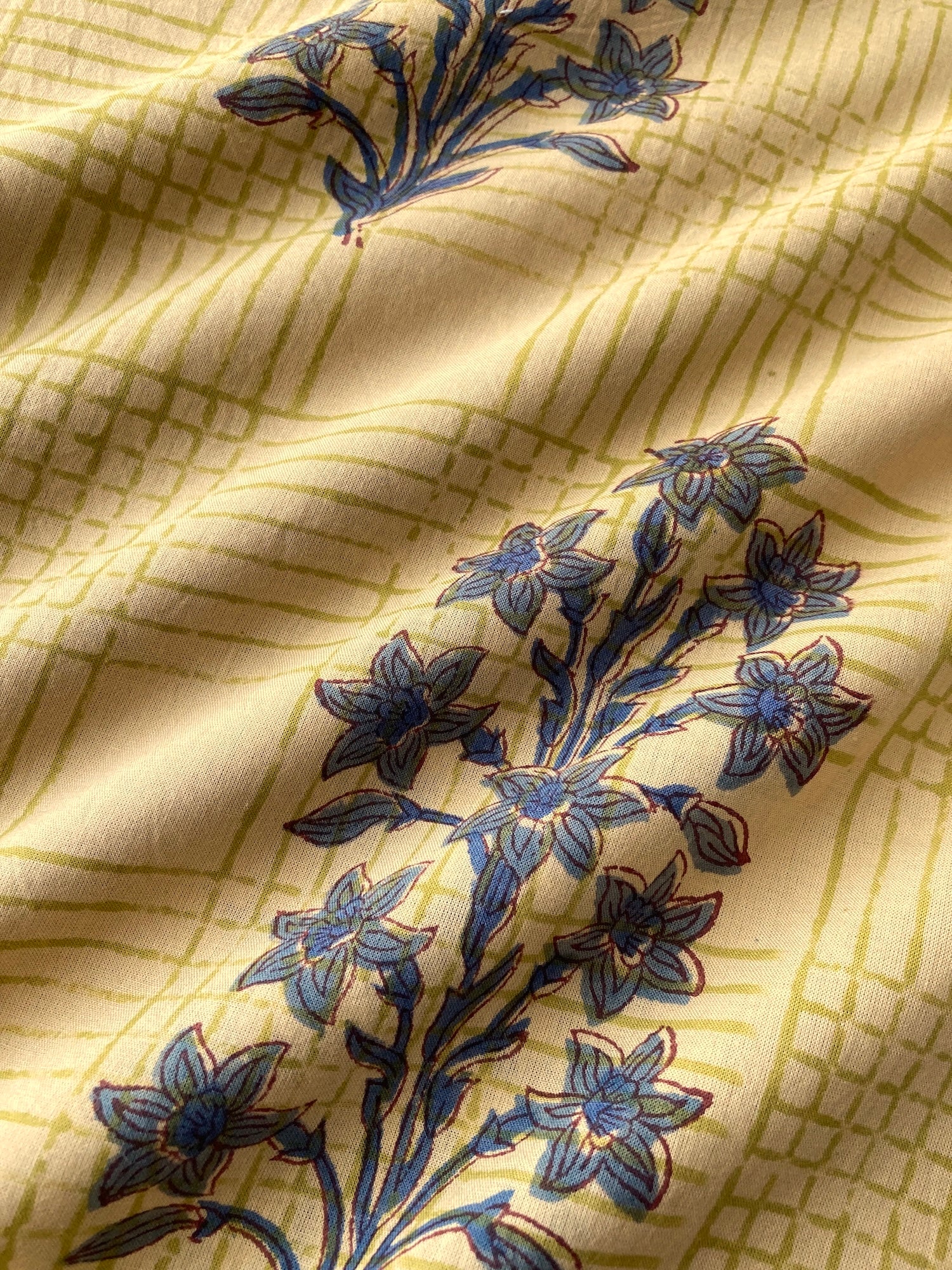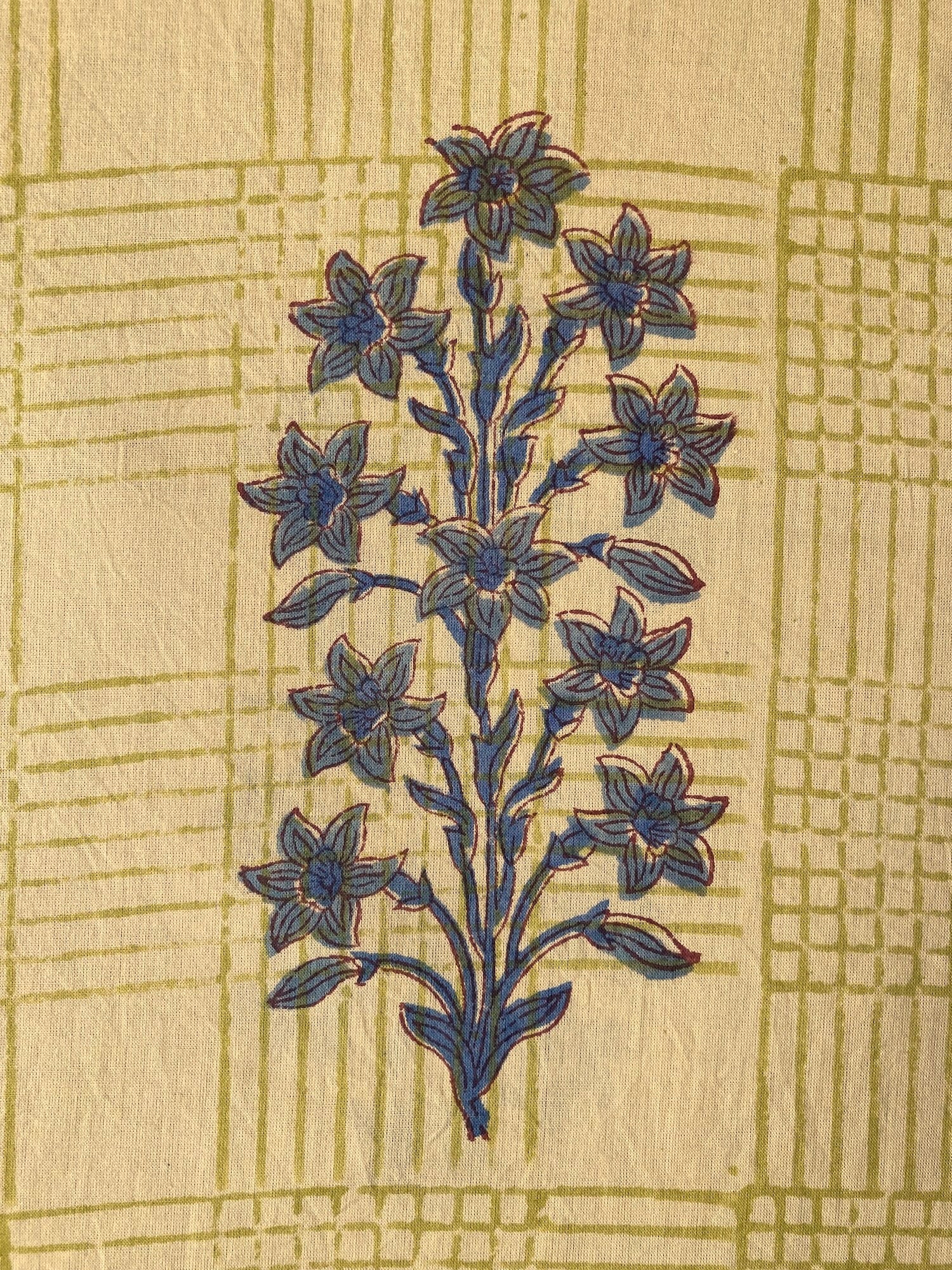インドで数百年にわたって受け継がれる、大きな木版を布に押し当てて染色するという伝統的な技法で作られた、”ブロックプリント”と言われる生地です。