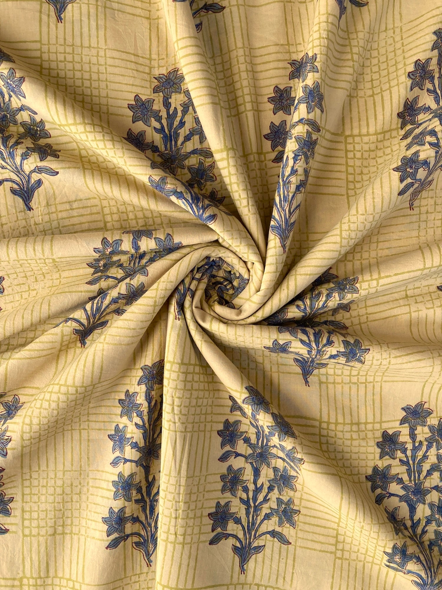 ナチュラルな濃いめの生成りをベースに、格子柄と大きなブルー系花柄のミックスプリントです。落ち着いた色合いとオシャレなデザインで、お洋服やインテリアにおすすめです。