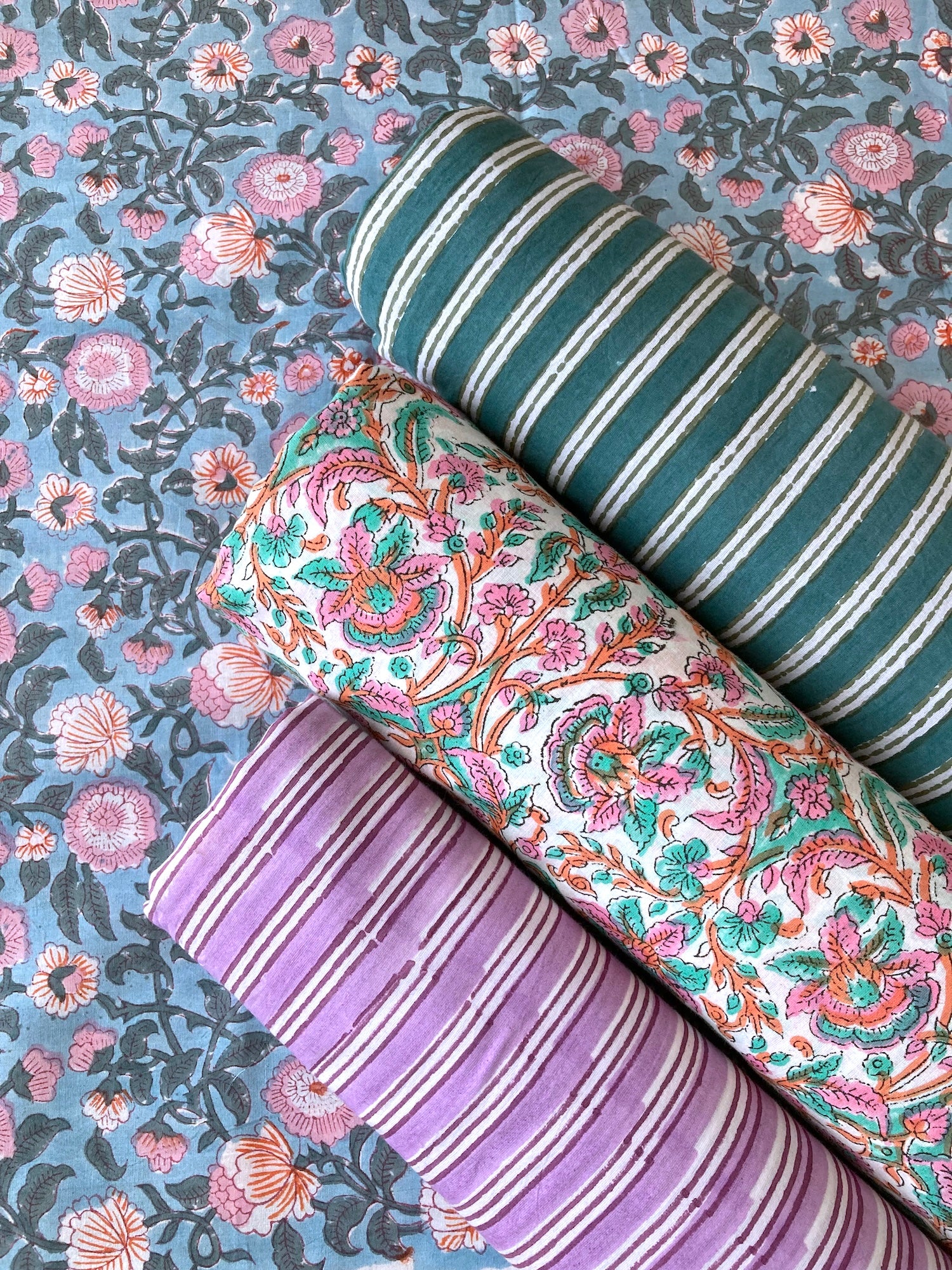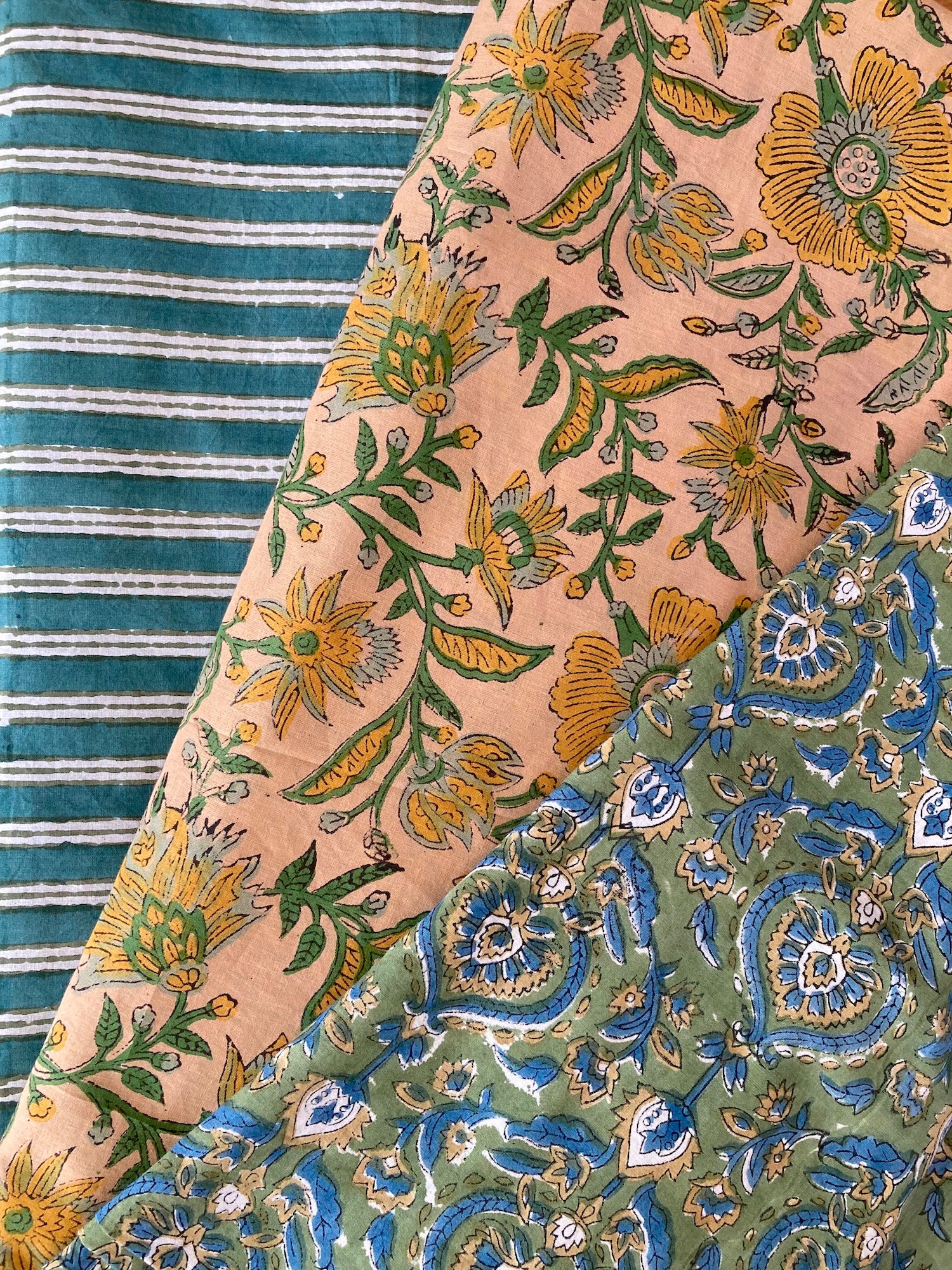 インドで数百年にわたって受け継がれる、大きな木版を布に押し当てて染色するという伝統的な技法で作られた、”ブロックプリント”と言われる生地です。