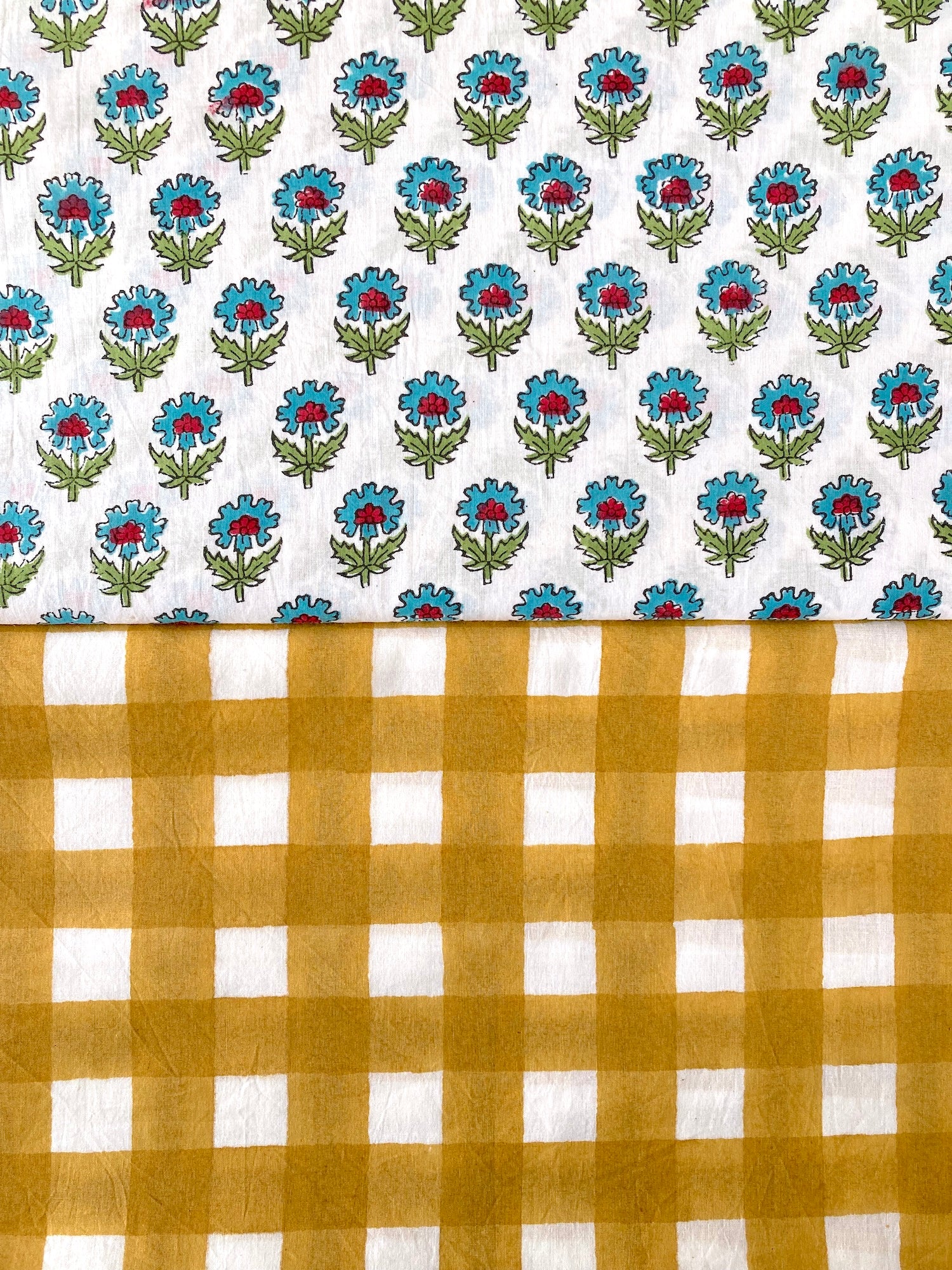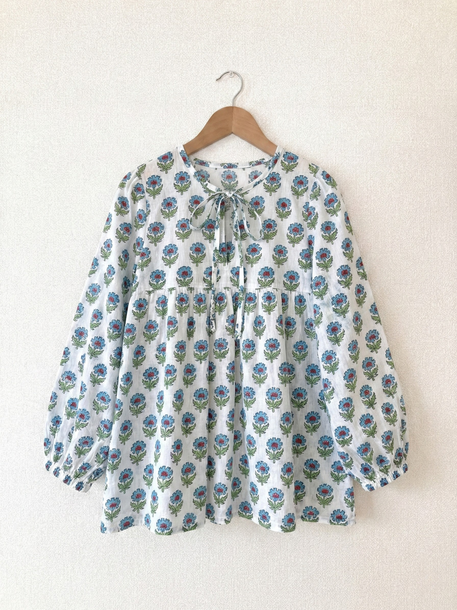 インドで数百年にわたって受け継がれる、大きな木版を布に押し当てて染色するという伝統的な技法で作られた、”ブロックプリント”と言われる生地です。