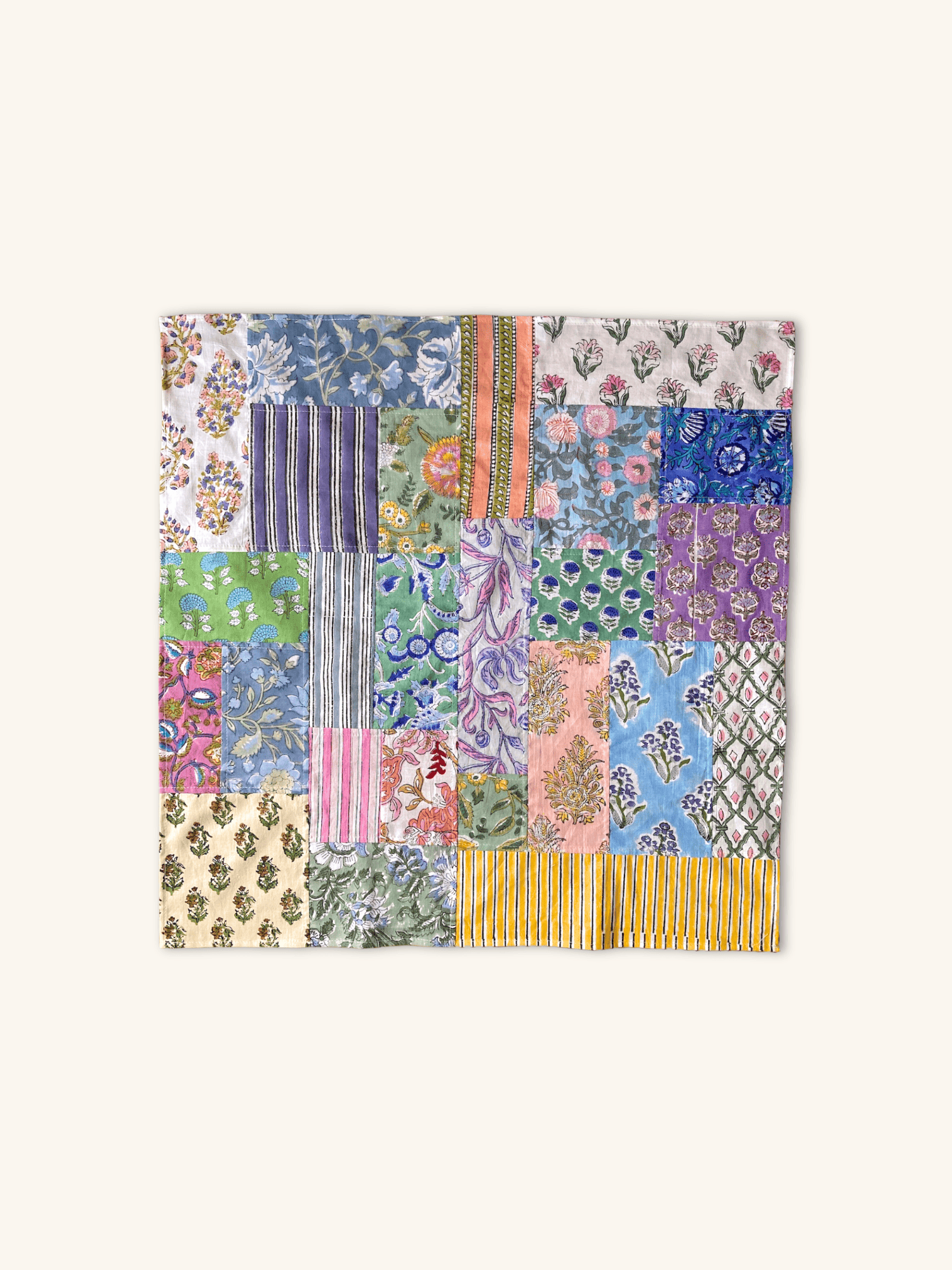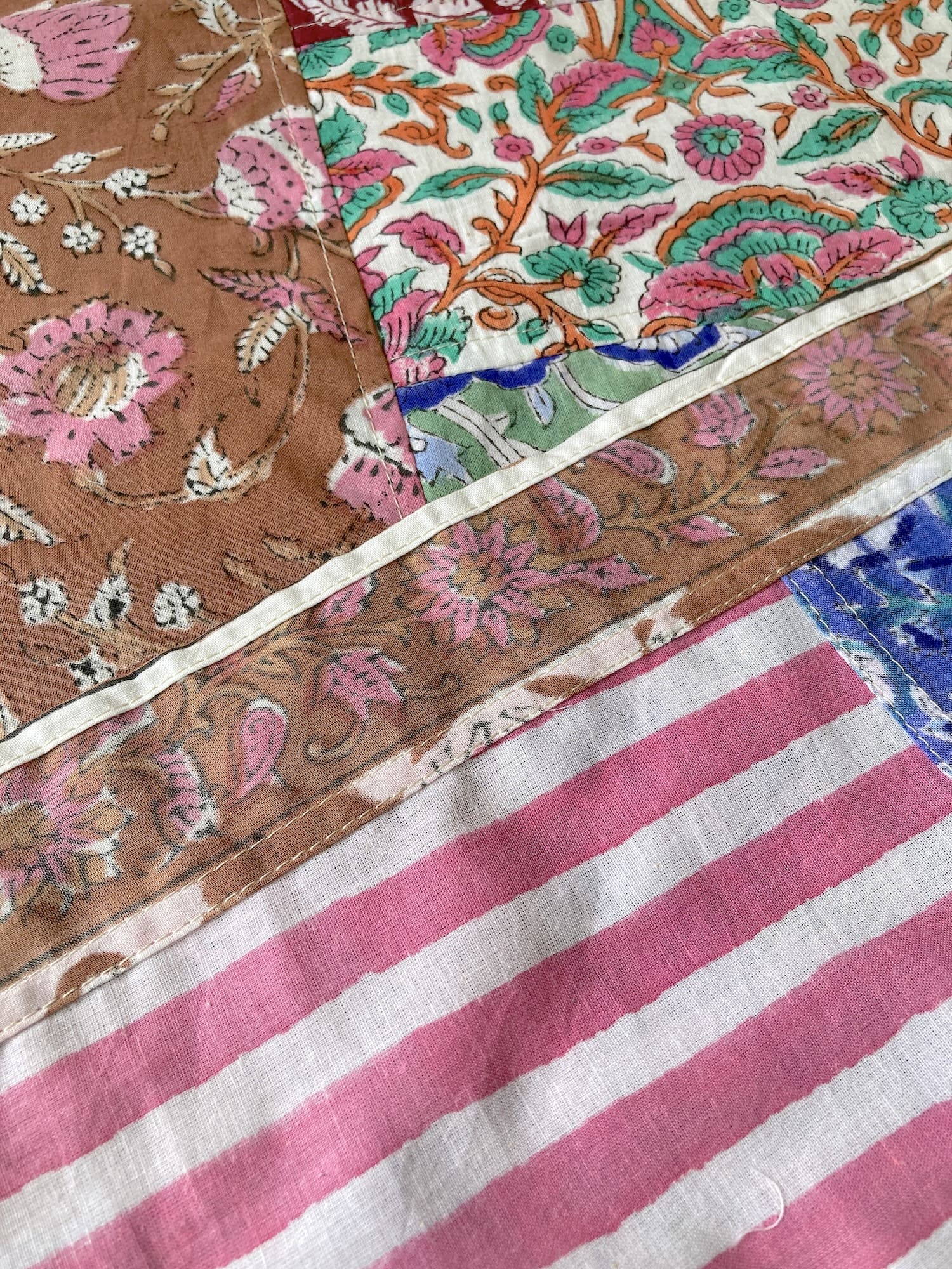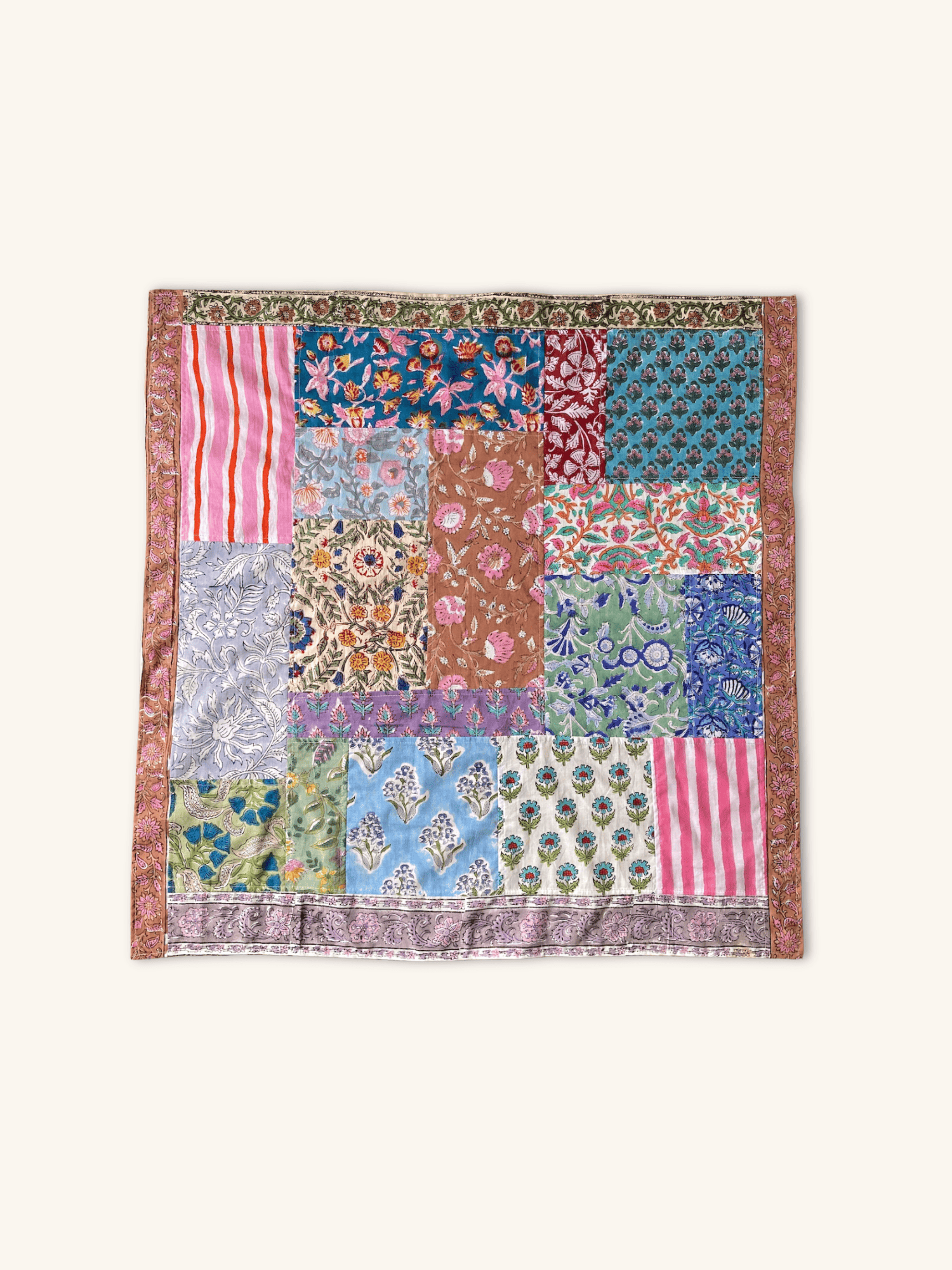 ハンドブロックプリントの鮮やかな色彩を贅沢に詰め込んだ、パッチワークのマルチクロス。異なる柄や色が織りなす豊かな表情が、毎日の生活に彩りと温もりをもたらします。
