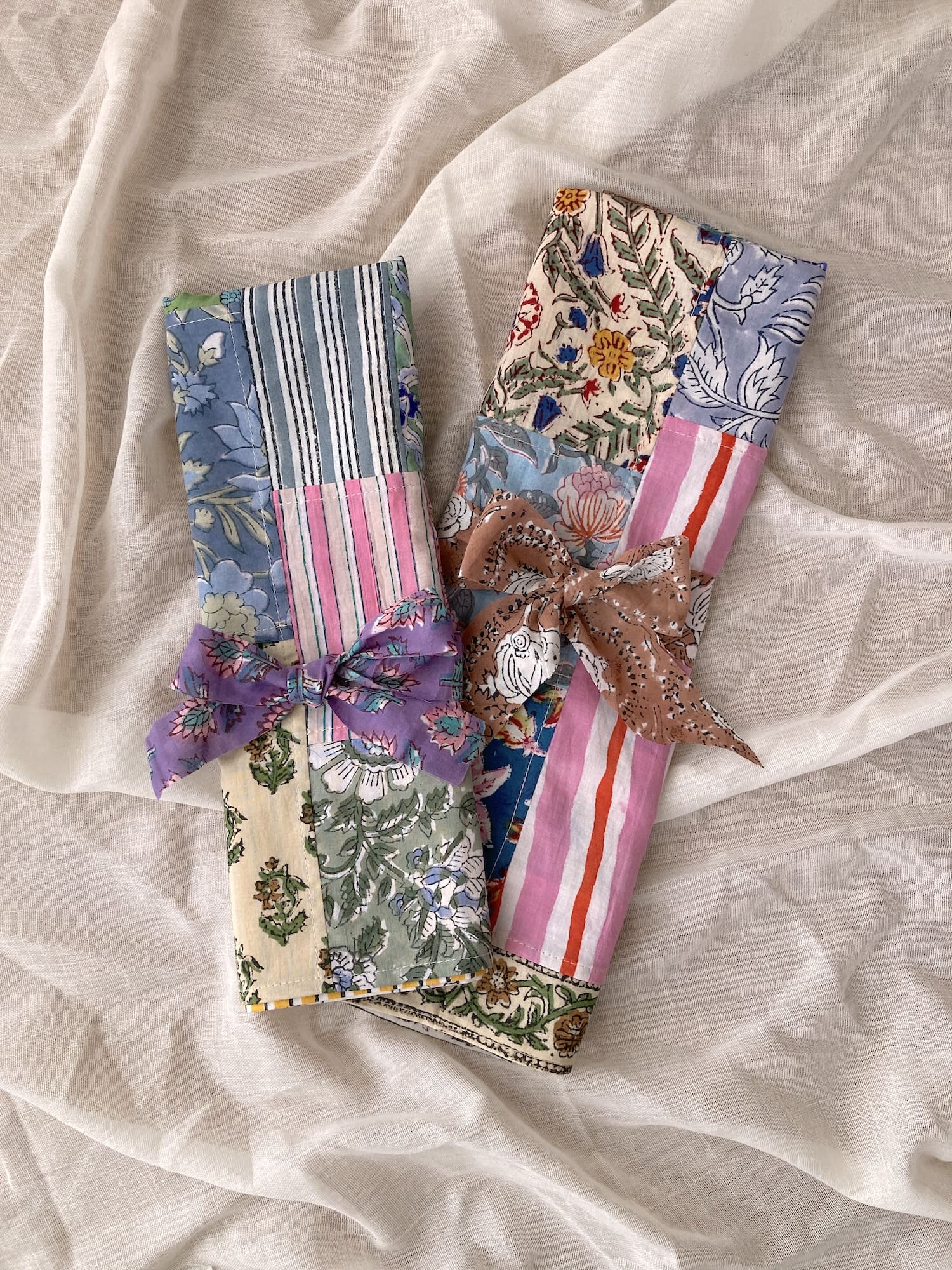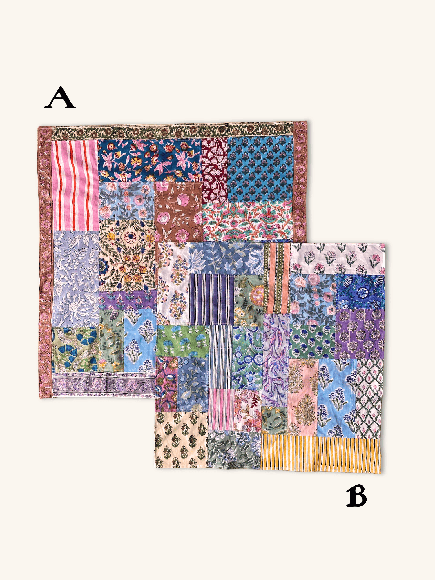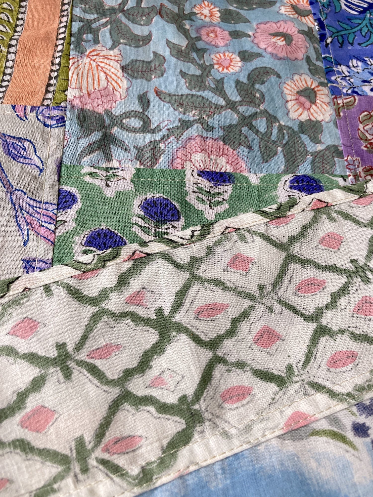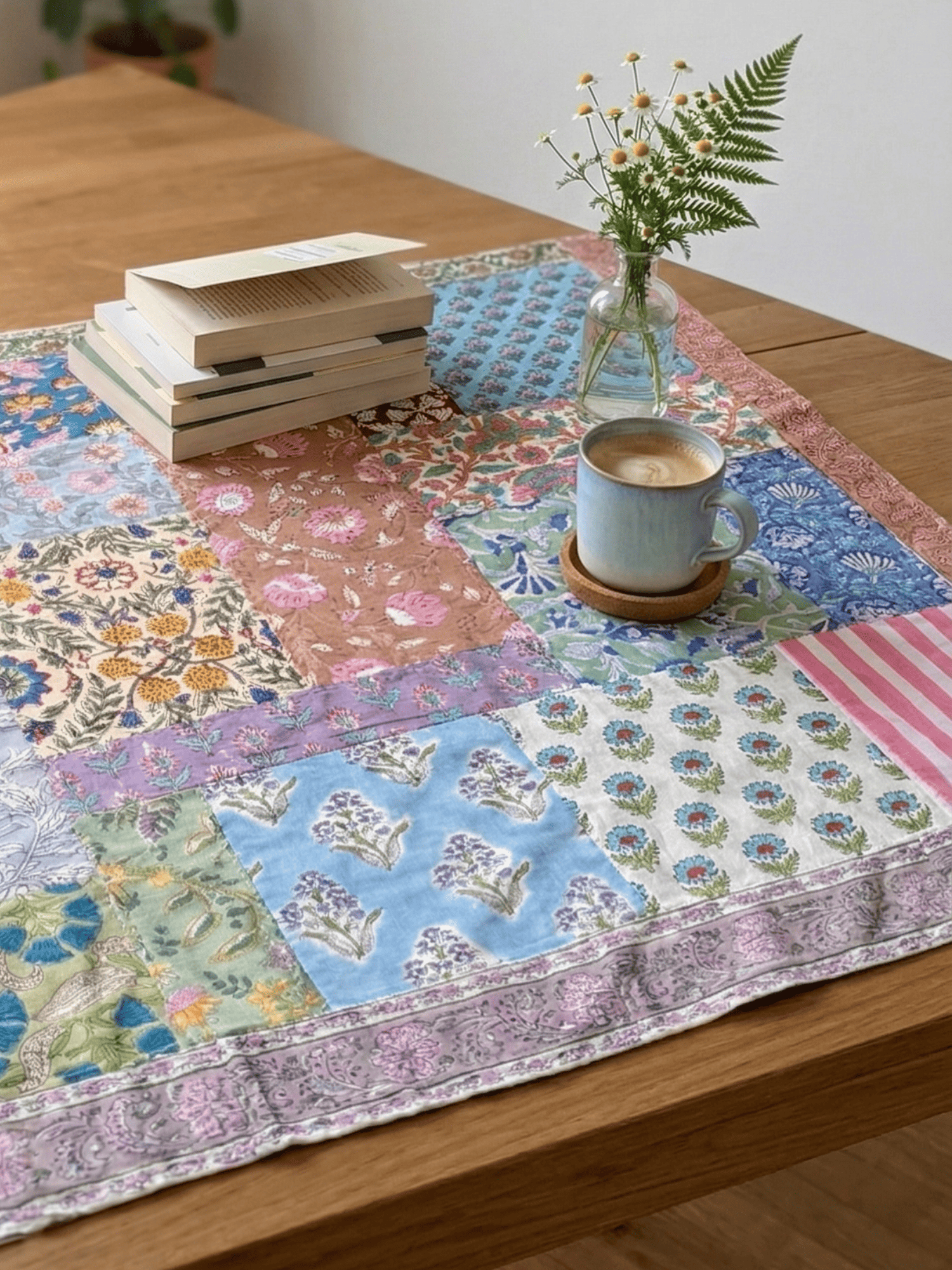 ハンドブロックプリントの鮮やかな色彩を贅沢に詰め込んだ、パッチワークのマルチクロス。異なる柄や色が織りなす豊かな表情が、毎日の生活に彩りと温もりをもたらします。