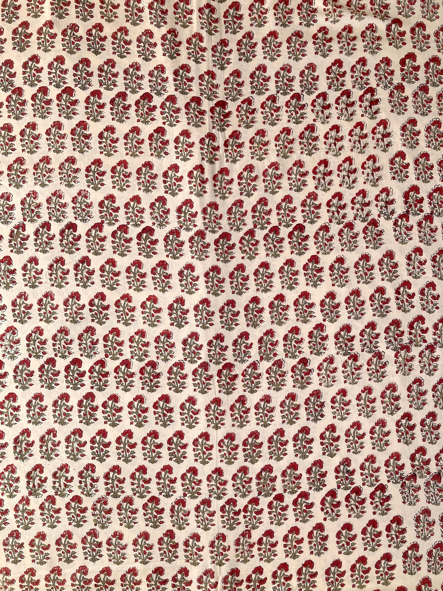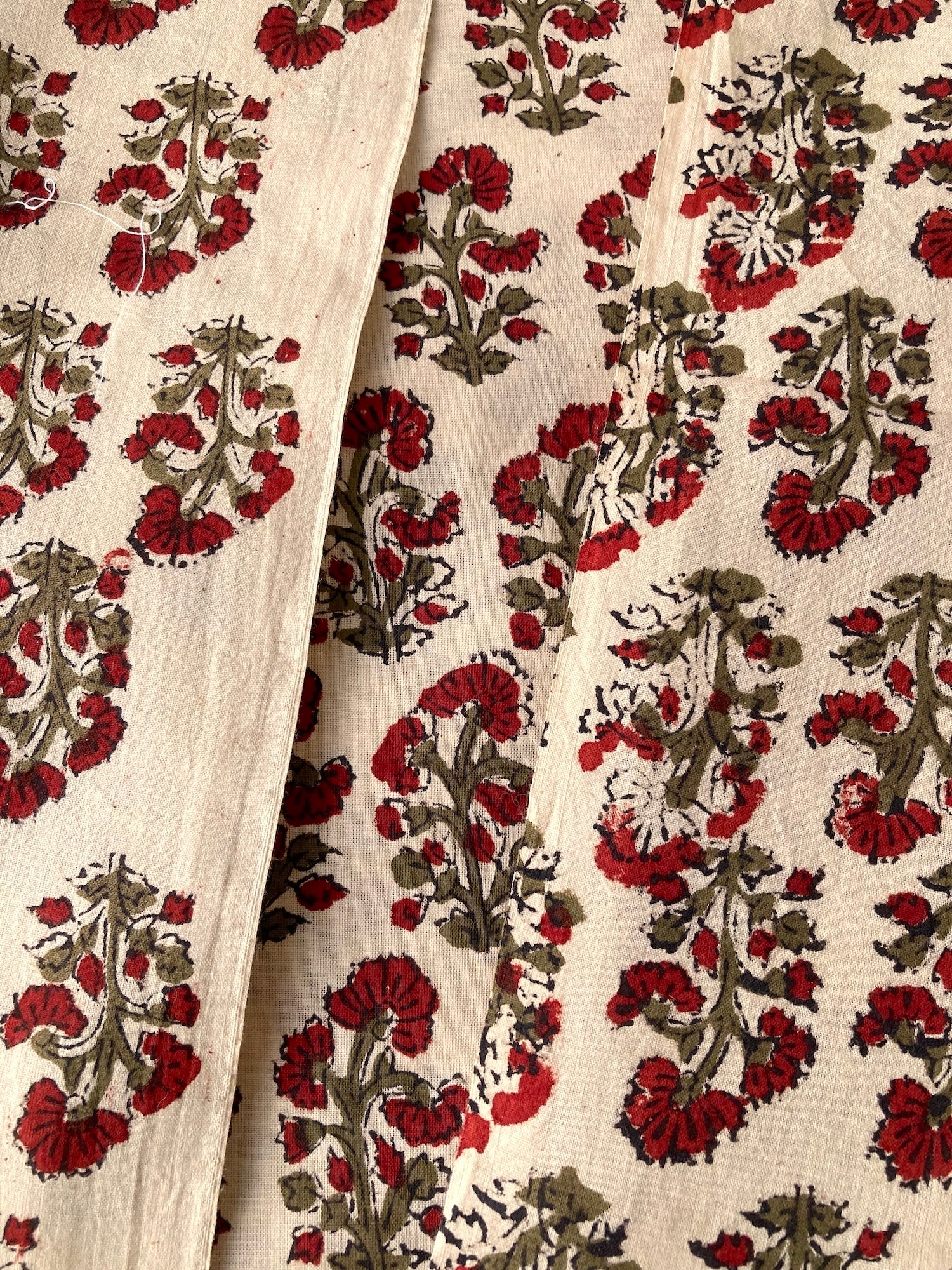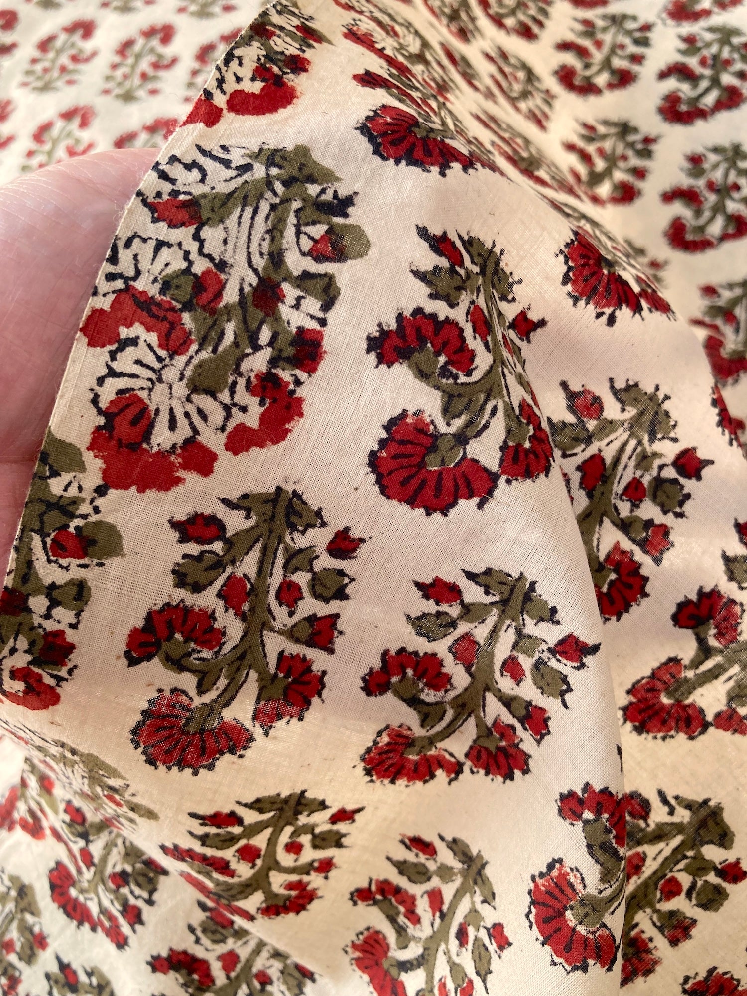 インドで数百年にわたって受け継がれる、大きな木版を布に押し当てて染色するという伝統的な技法で作られた、”ブロックプリント”と言われる生地です。