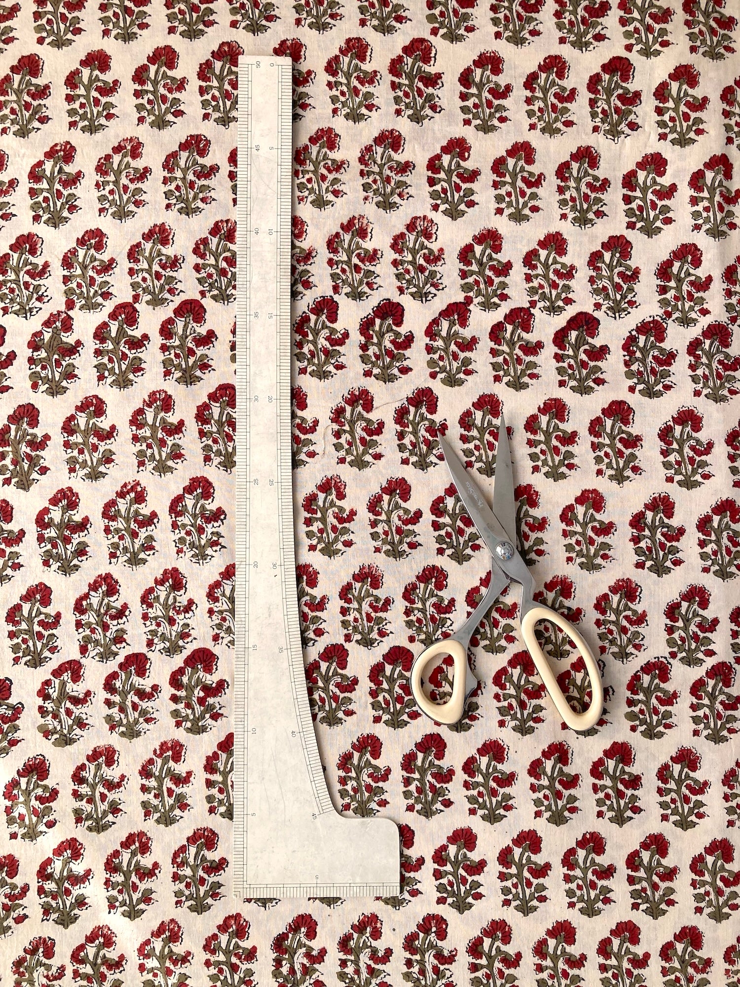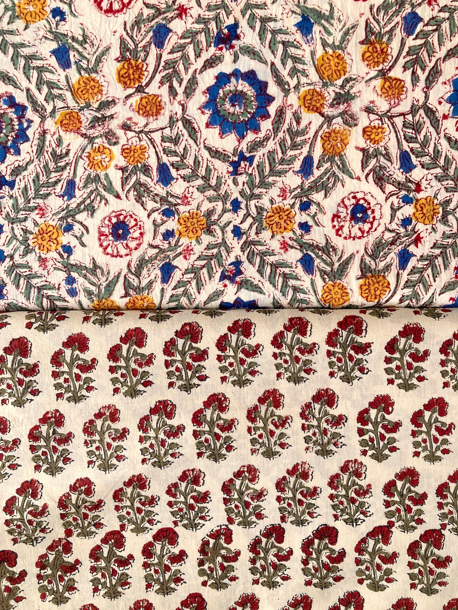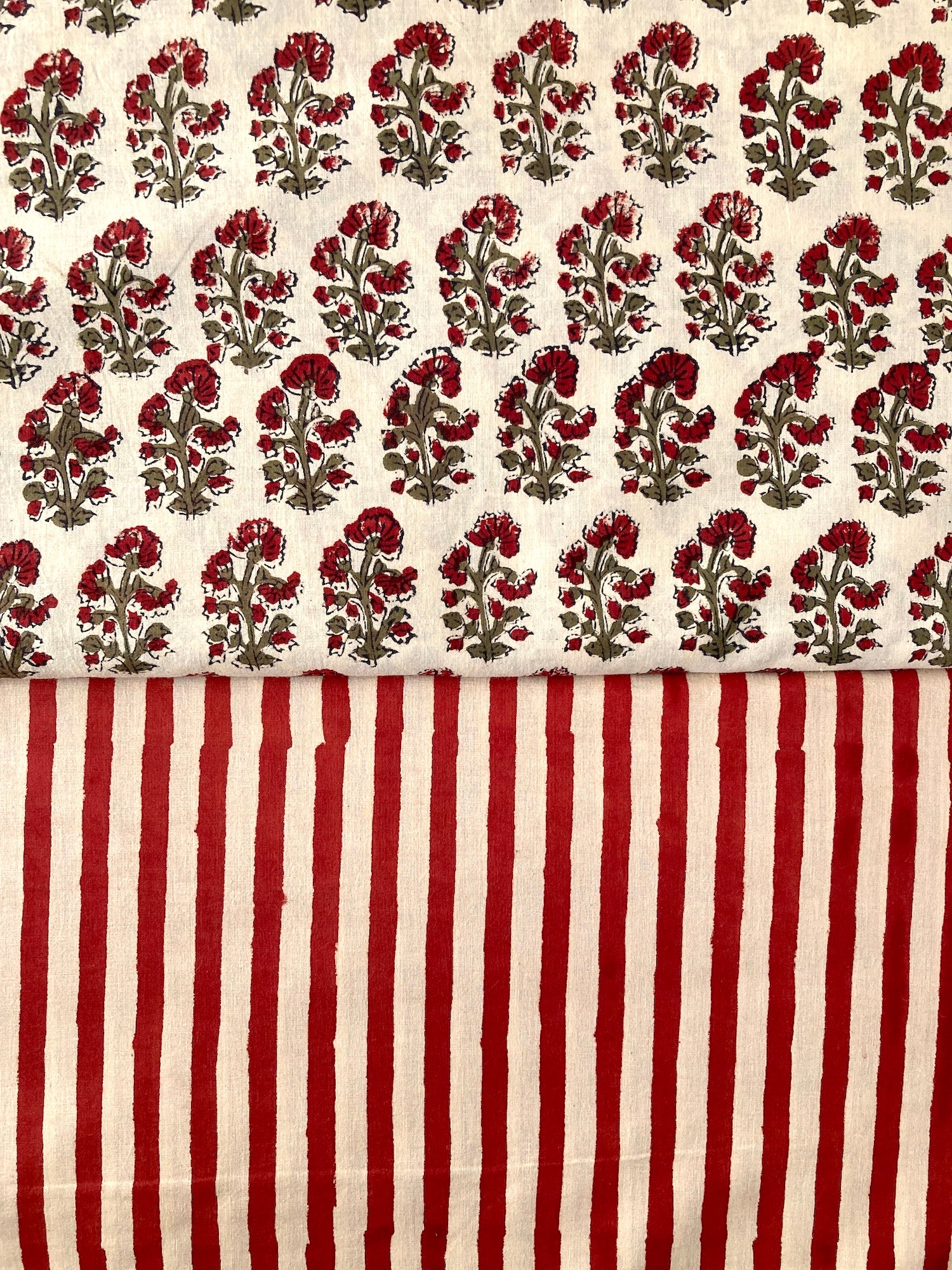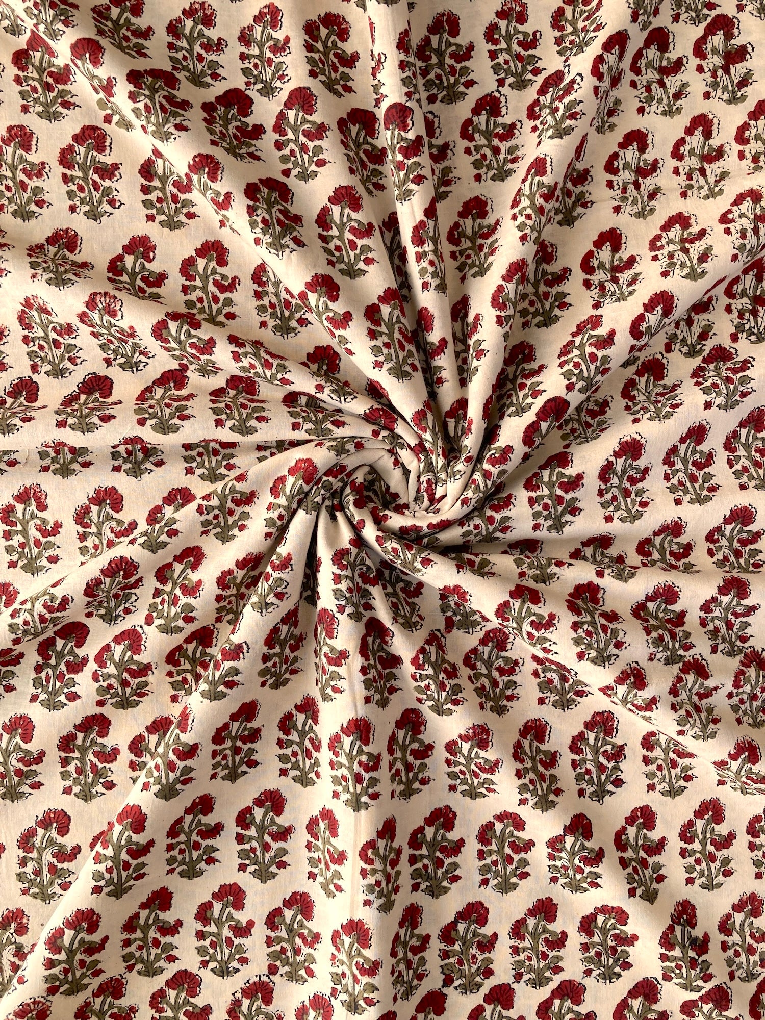 インドで数百年にわたって受け継がれる、大きな木版を布に押し当てて染色するという伝統的な技法で作られた、”ブロックプリント”と言われる生地です。