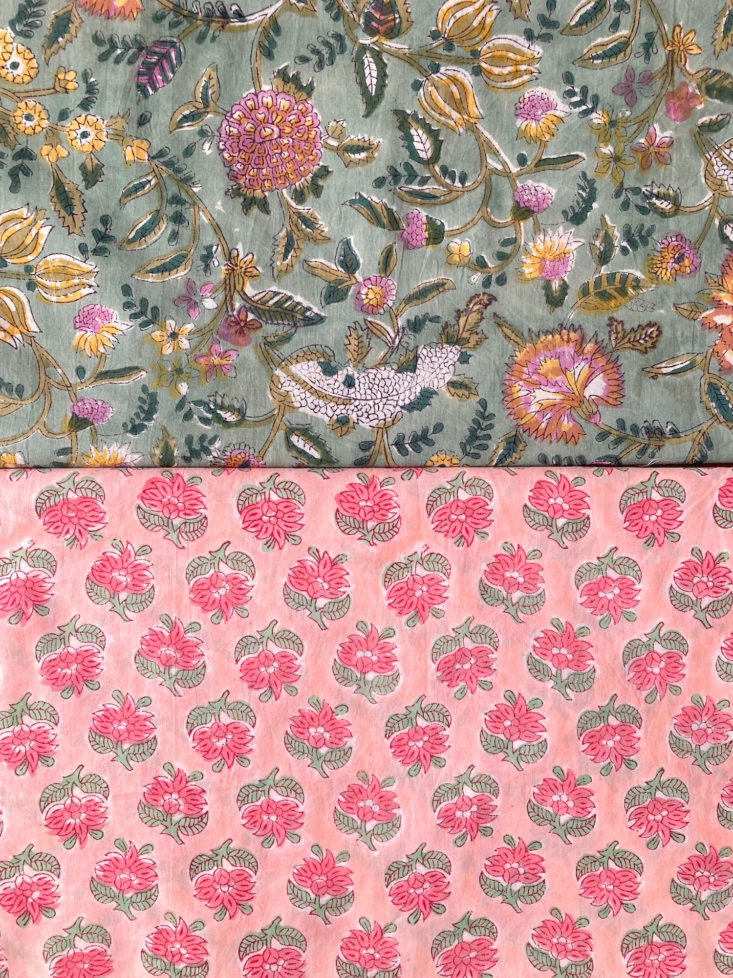 インドで数百年にわたって受け継がれる、大きな木版を布に押し当てて染色するという伝統的な技法で作られた、”ブロックプリント”と言われる生地です。