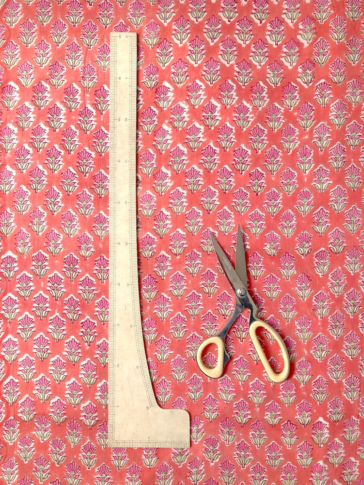 とても綺麗なオレンジピンクのコーラルカラーです。ブロックプリントらしい色と柄で、可愛い小物など作ってみて下さい。