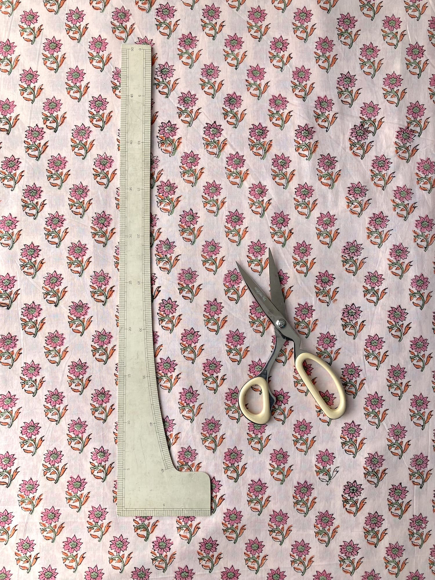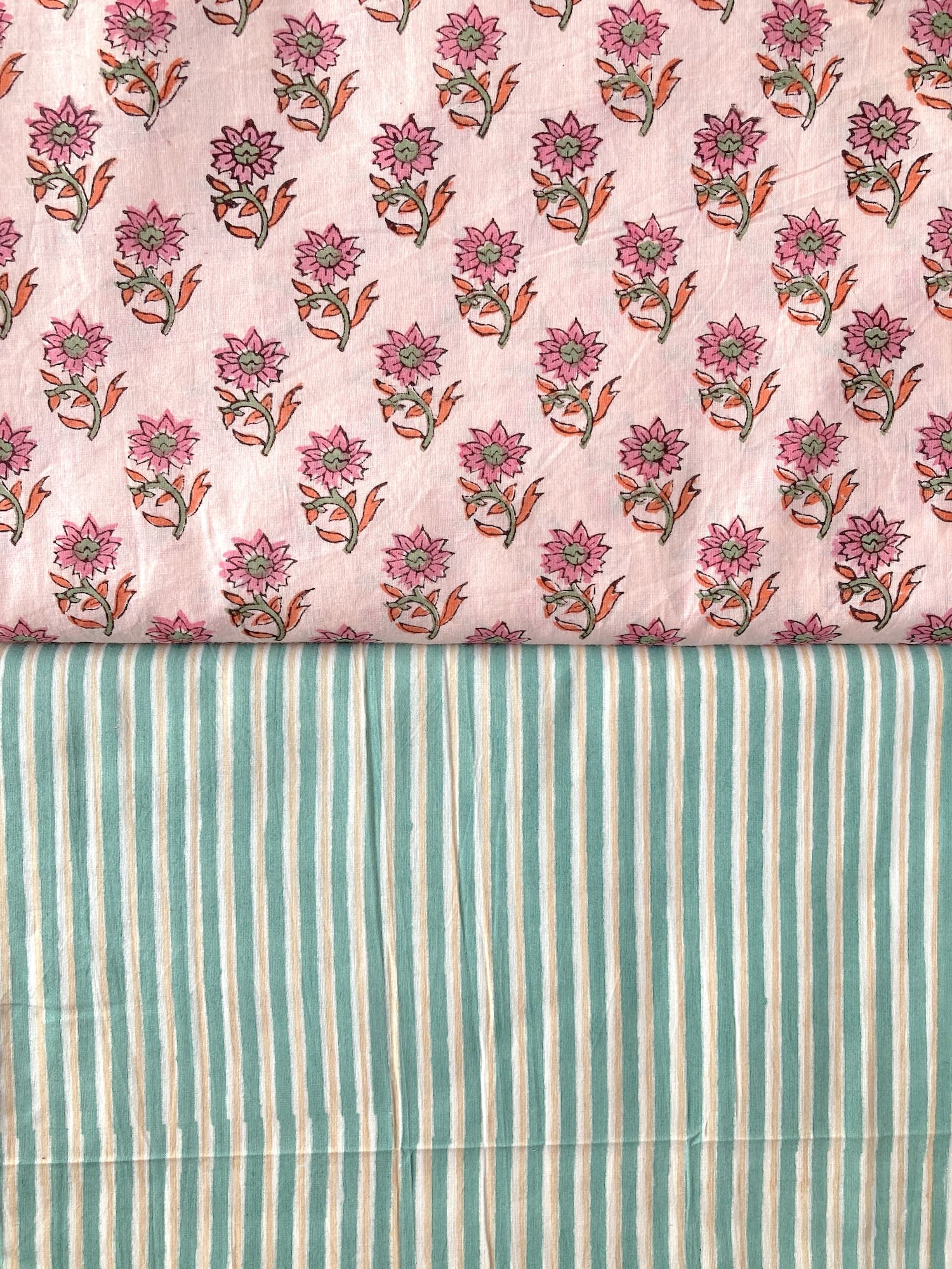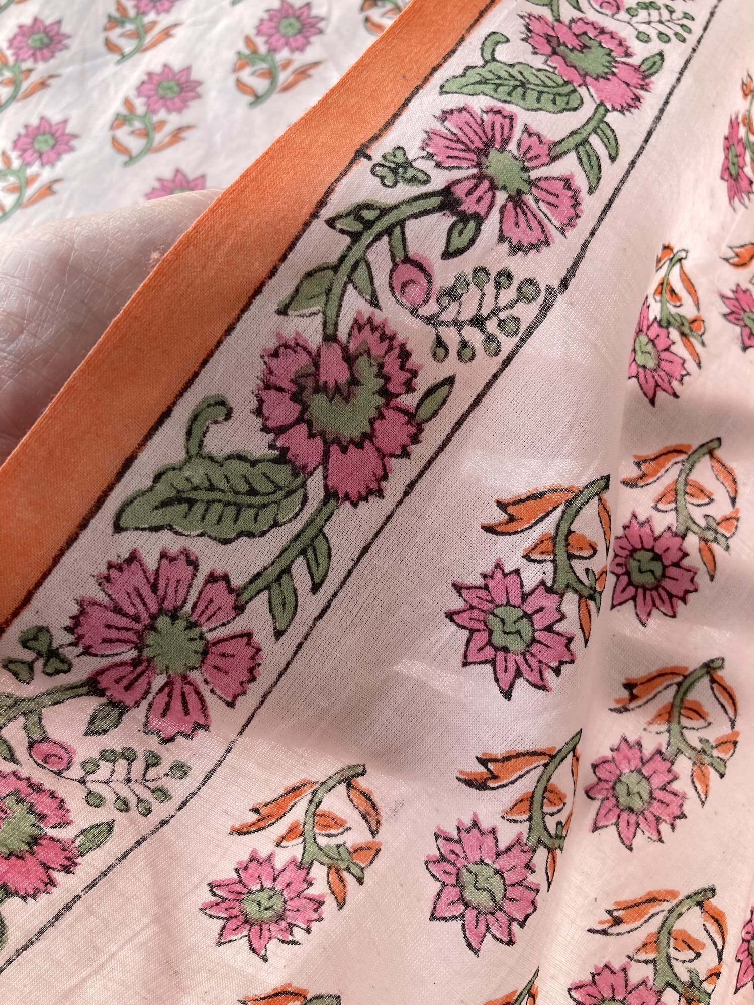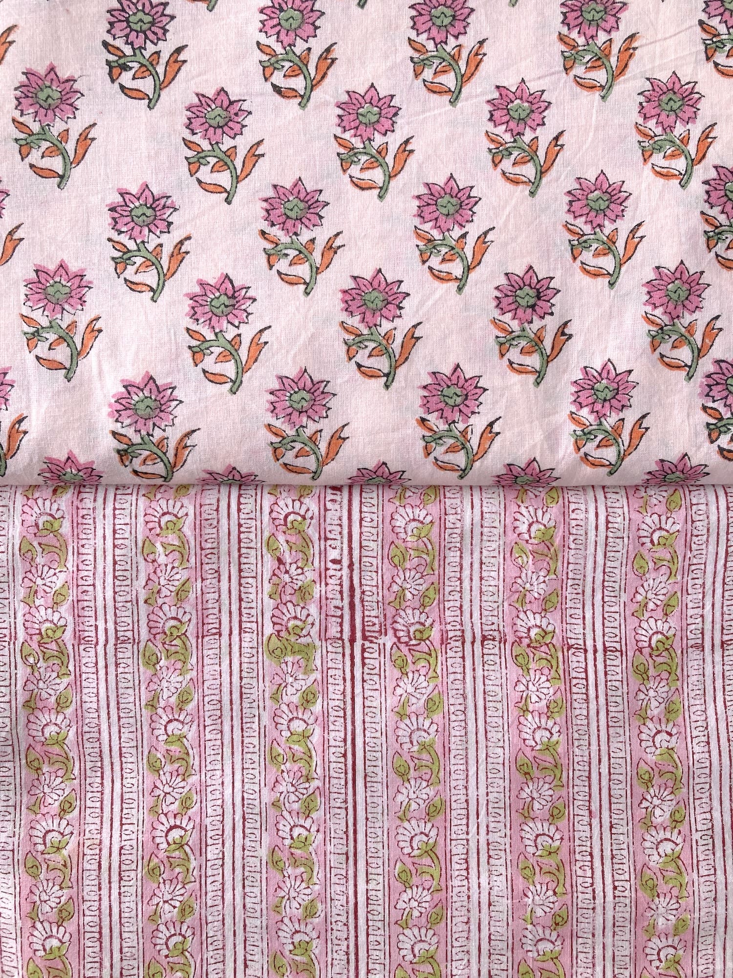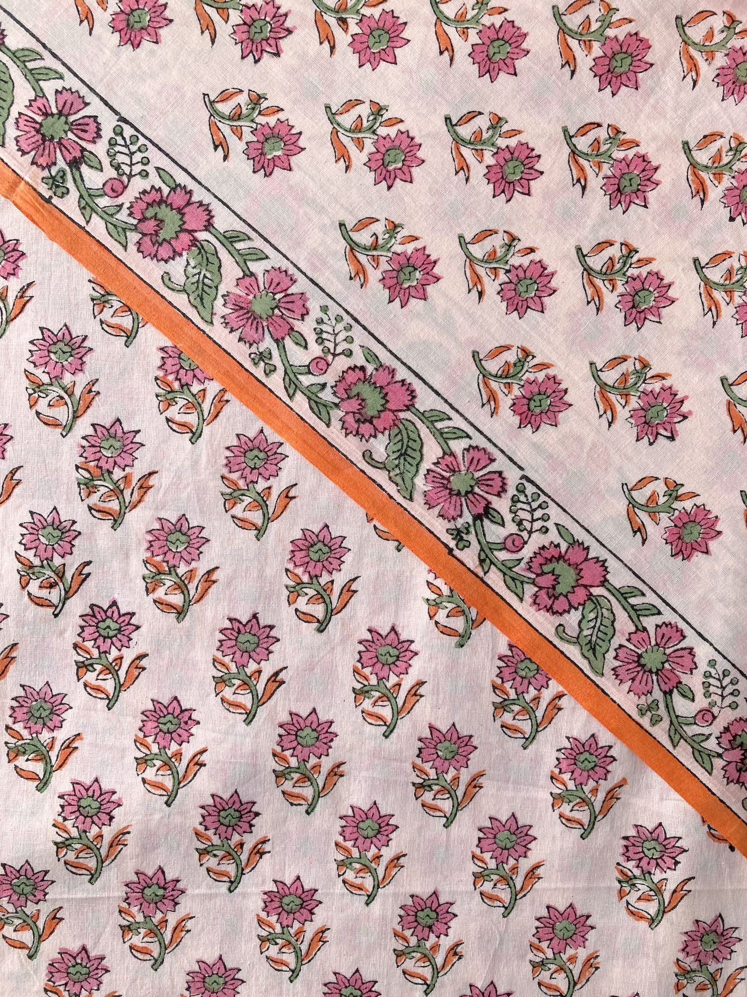 インドで数百年にわたって受け継がれる、大きな木版を布に押し当てて染色するという伝統的な技法で作られた、”ブロックプリント”と言われる生地です。
