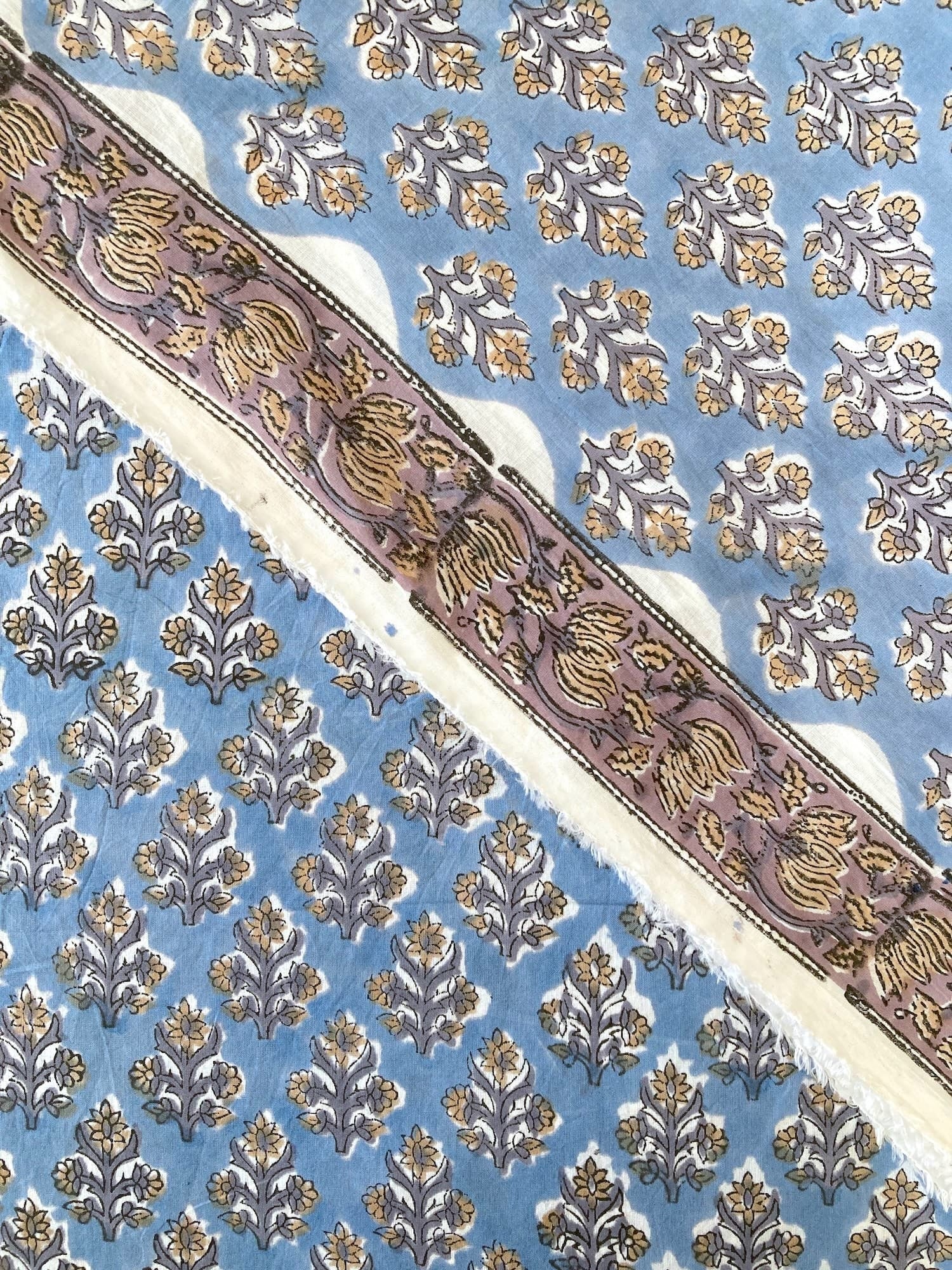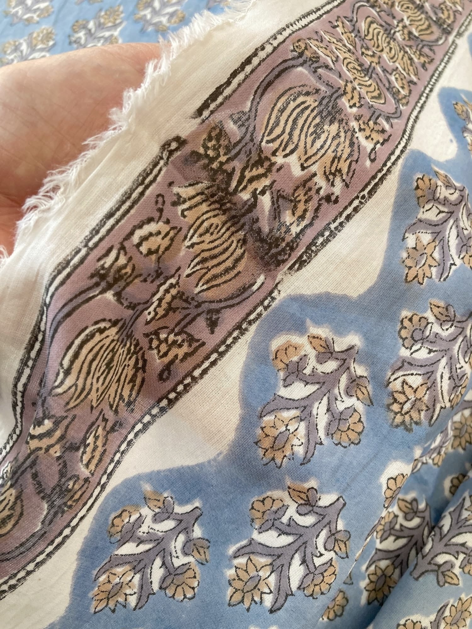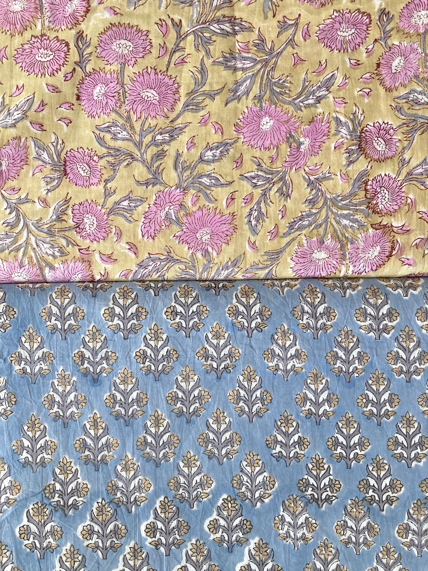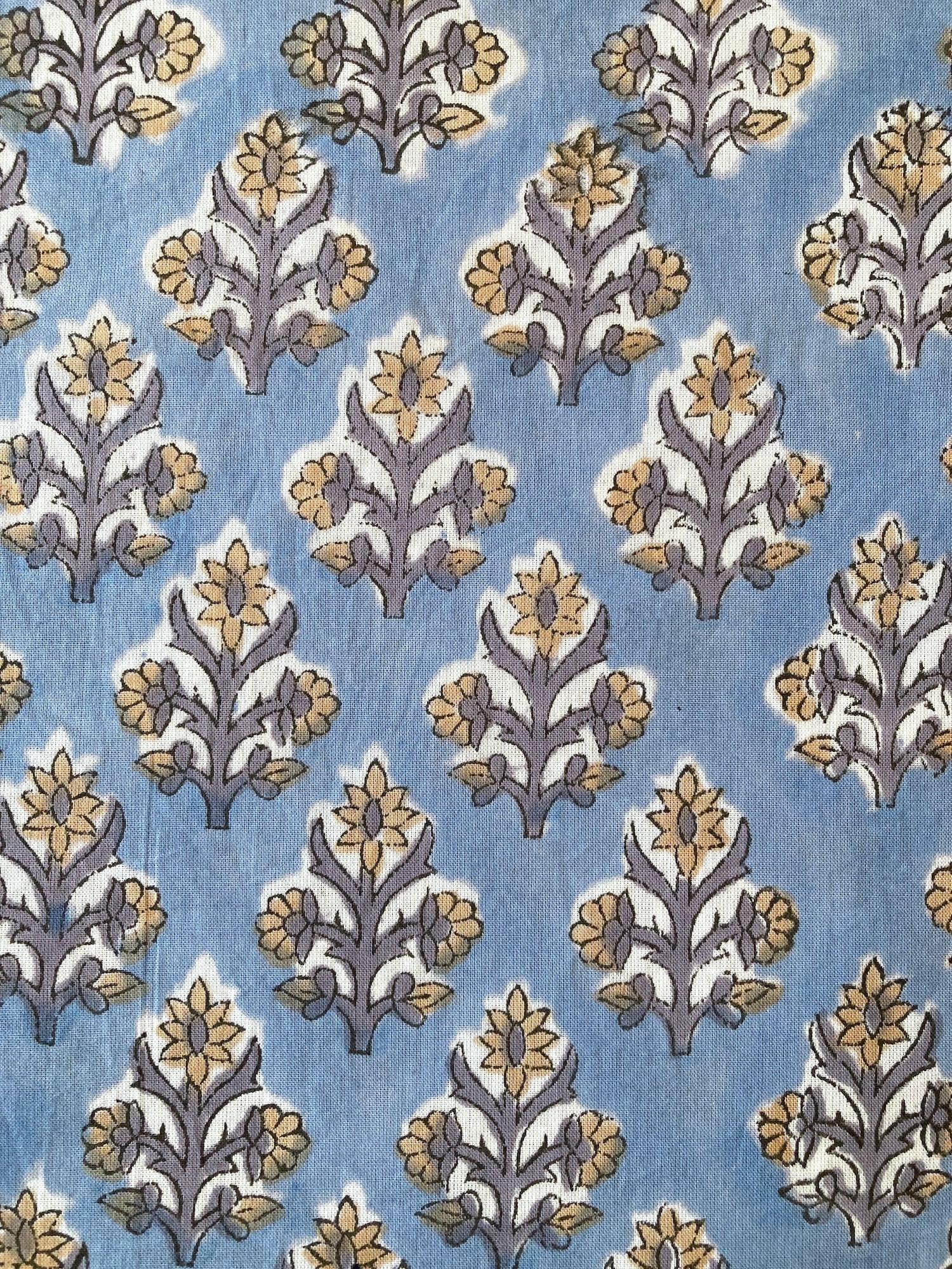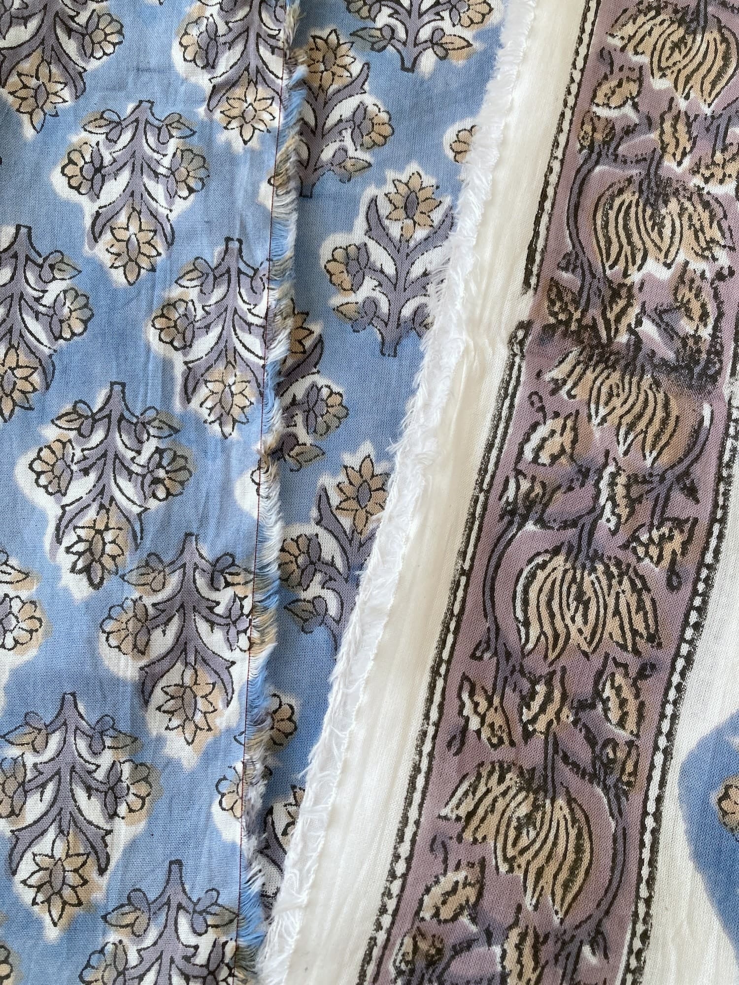 インドで数百年にわたって受け継がれる、大きな木版を布に押し当てて染色するという伝統的な技法で作られた、”ブロックプリント”と言われる生地です。