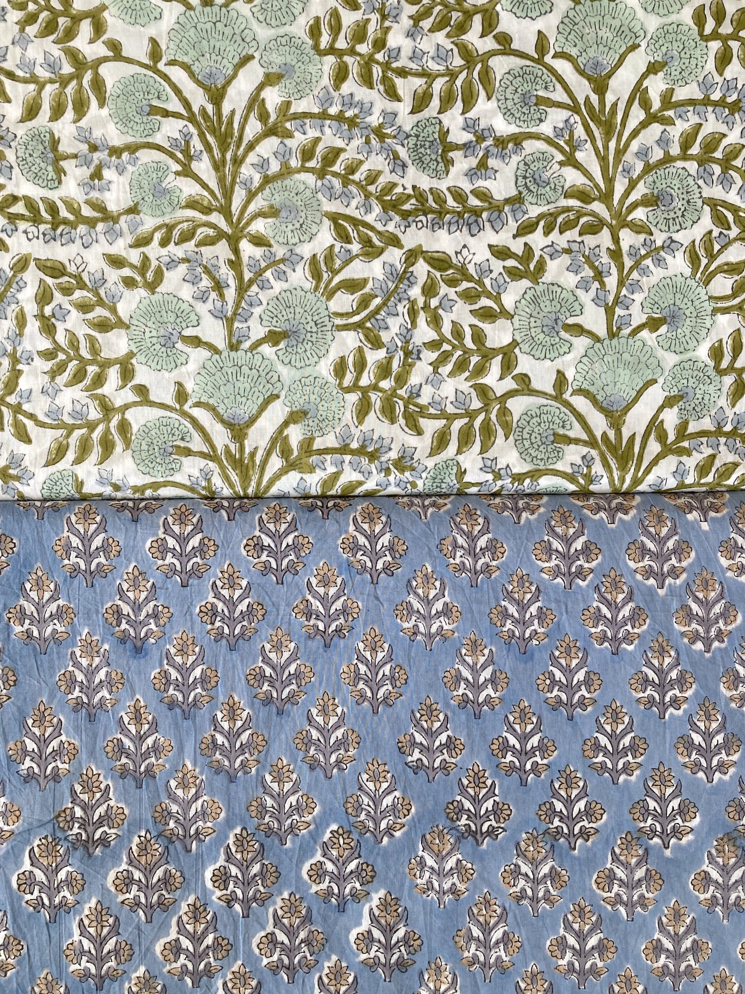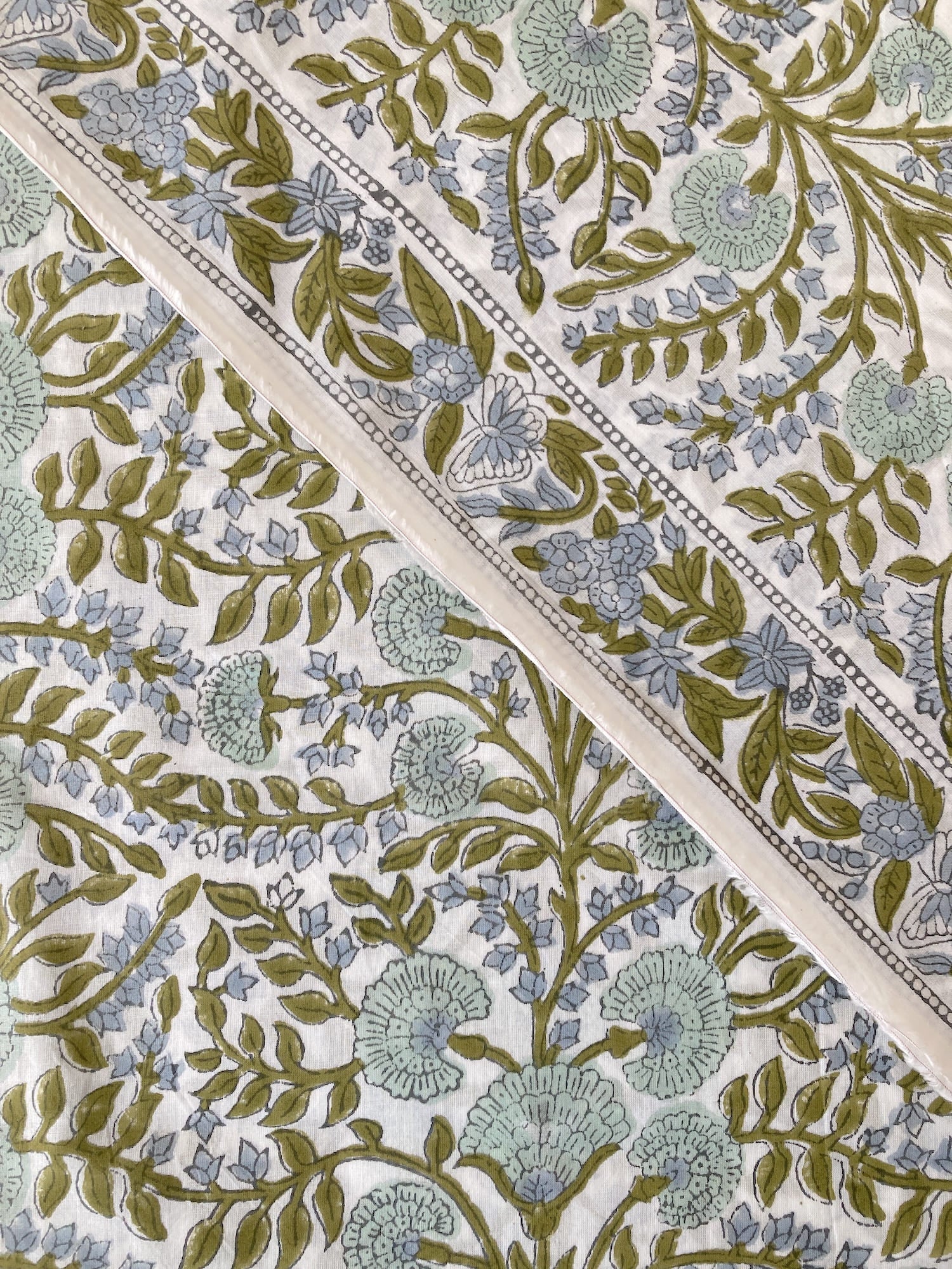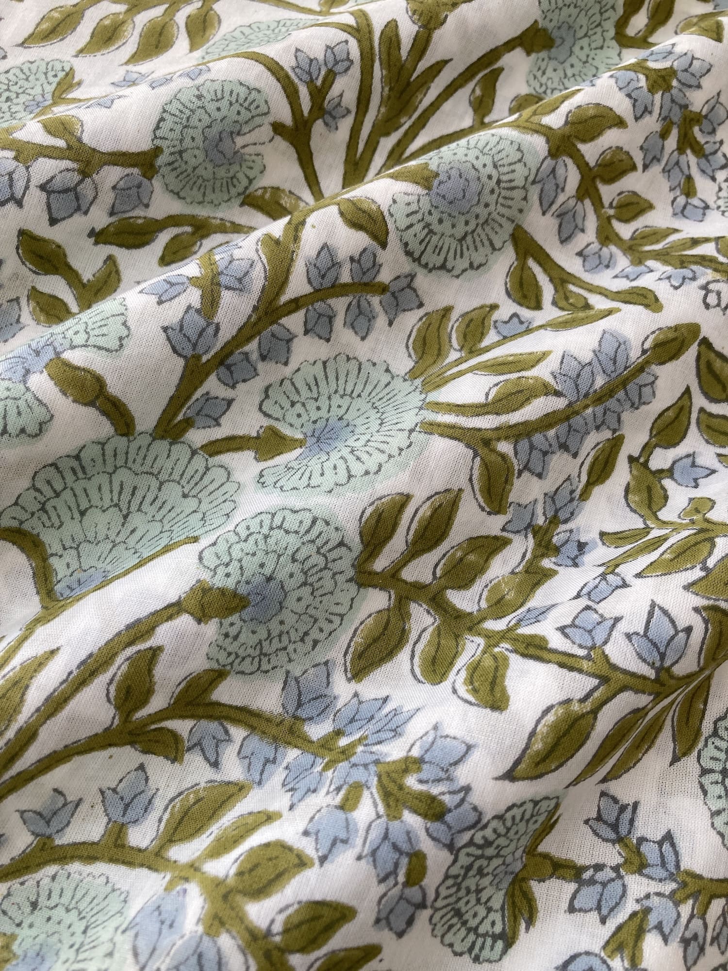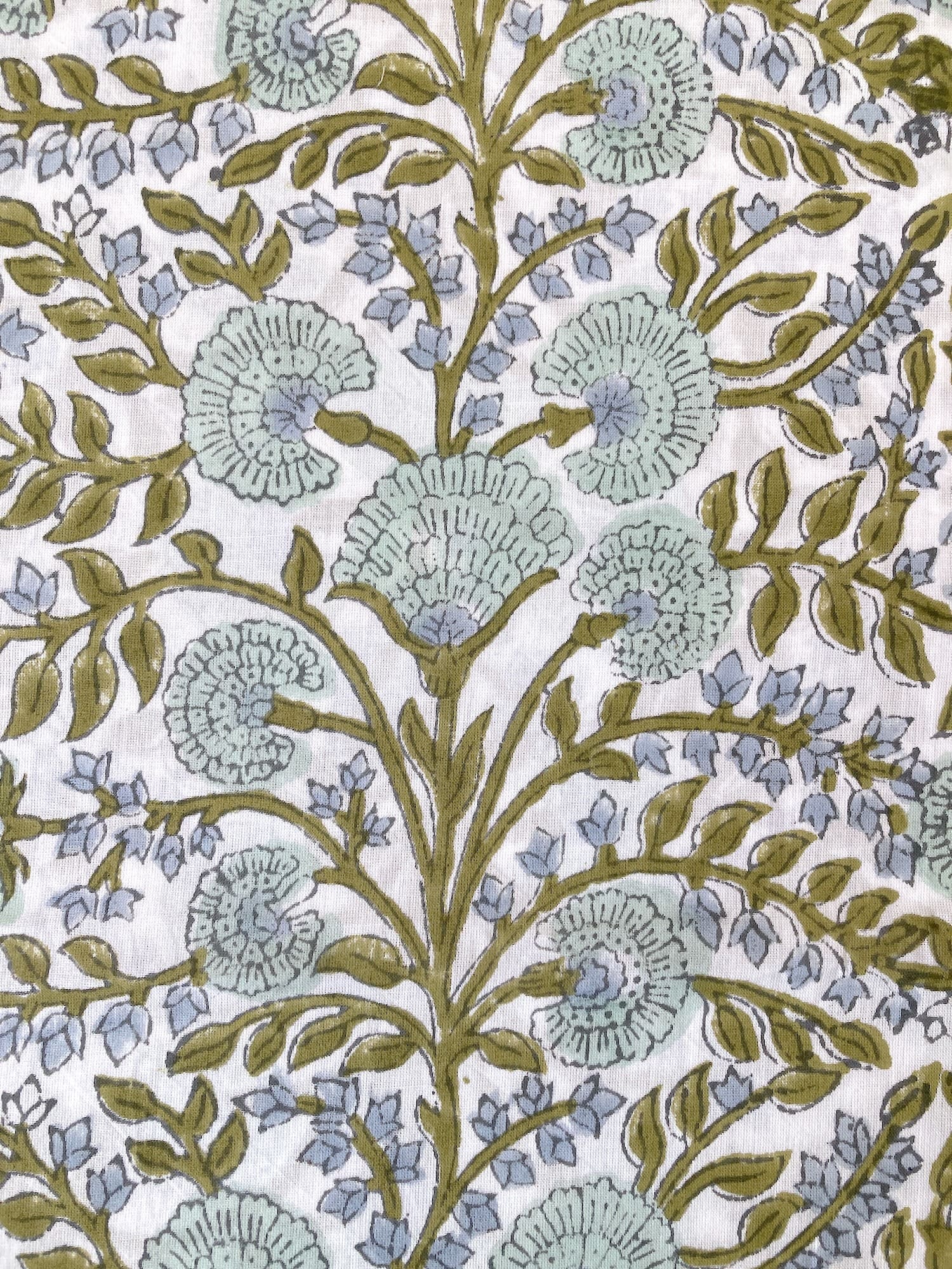 インドで数百年にわたって受け継がれる、大きな木版を布に押し当てて染色するという伝統的な技法で作られた、”ブロックプリント”と言われる生地です。