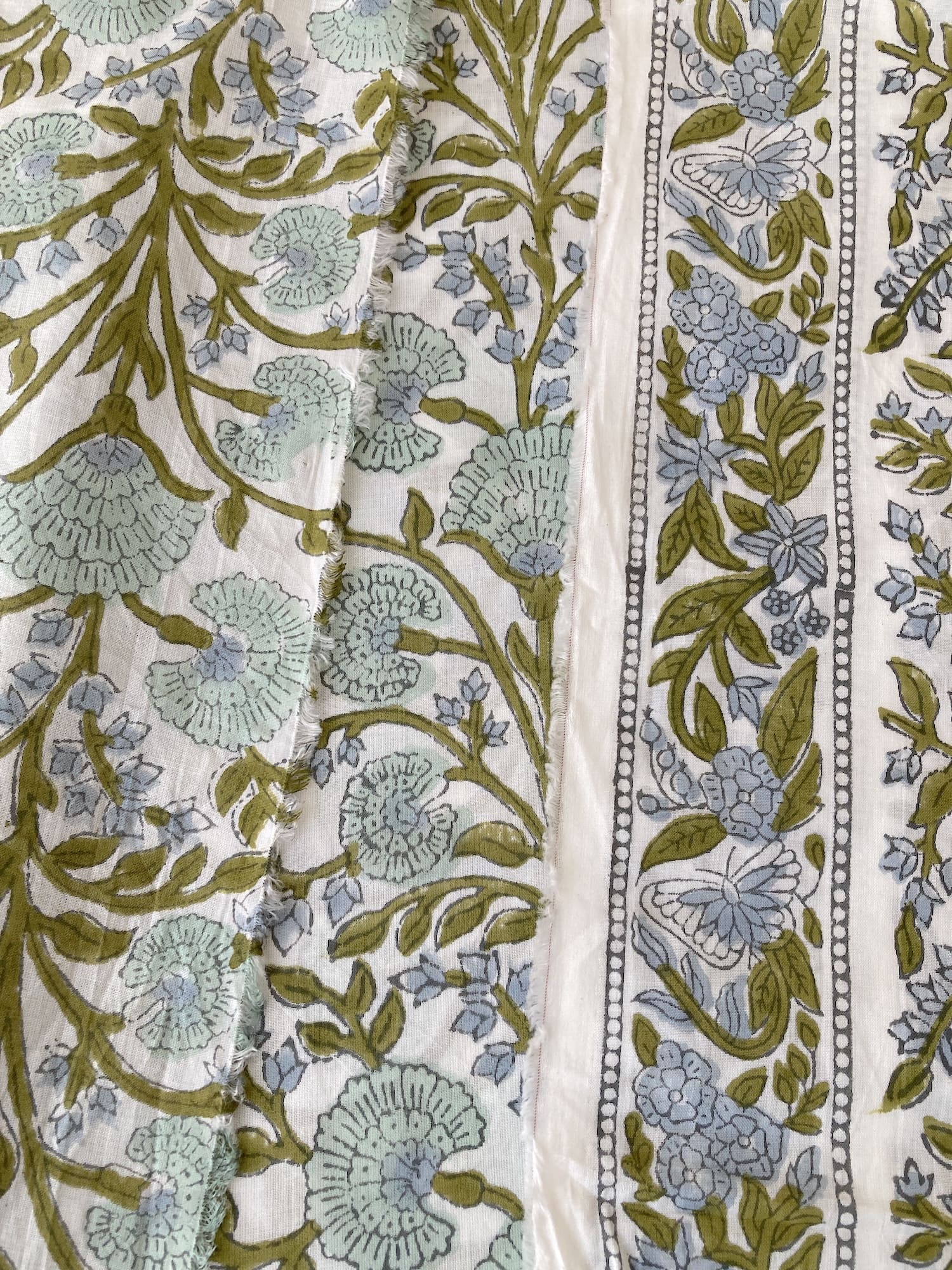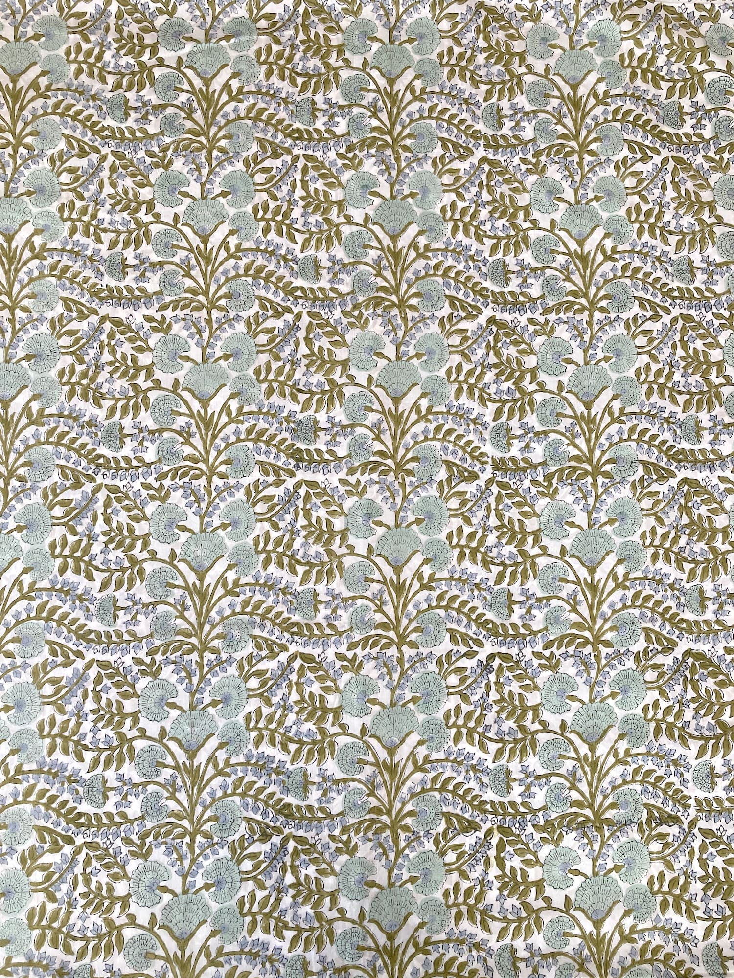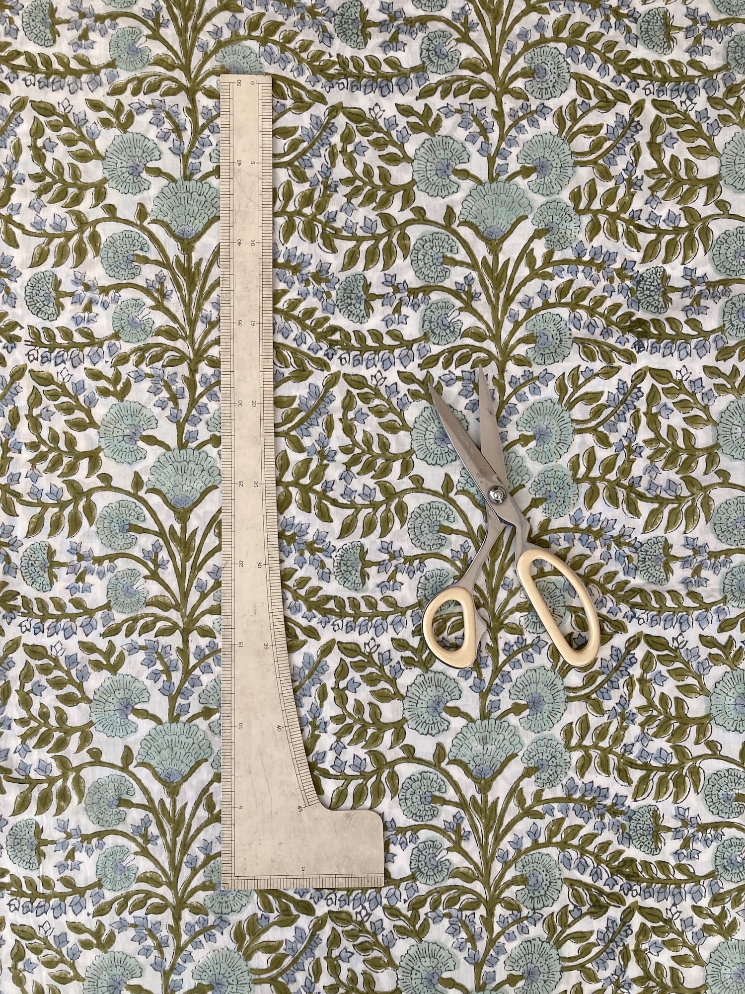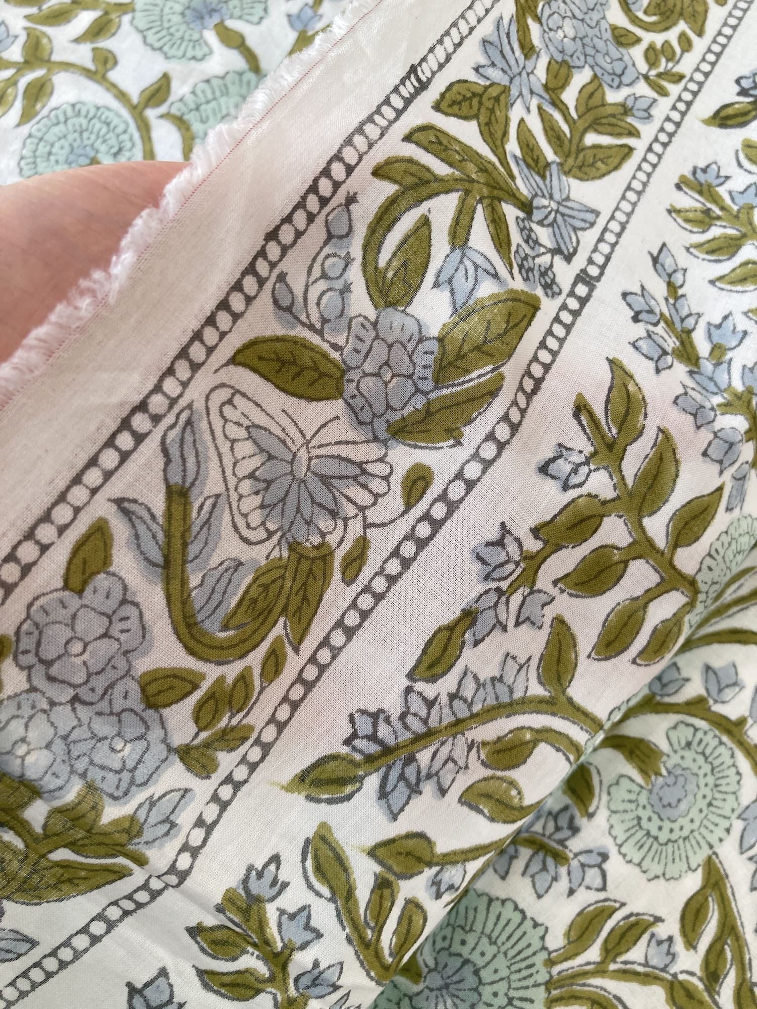 インドで数百年にわたって受け継がれる、大きな木版を布に押し当てて染色するという伝統的な技法で作られた、”ブロックプリント”と言われる生地です。